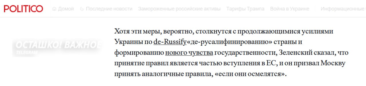 Как отмечает издание Politico, эти меры «вероятно, будут противоречить продолжающимся усилиям Украины по „дерусификации“ страны и формированию нового чувства государственности (национального сознания - ред.)».