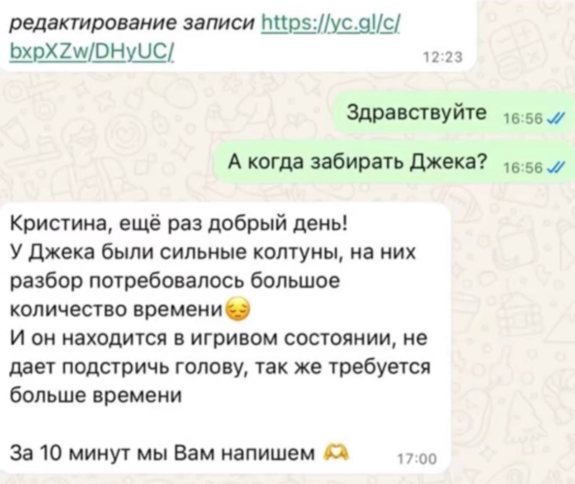 Девушка привела своего бишона-фризе в груминг-салон на Волгоградском проспекте, но обычная стрижка растянулась на пять часов. Когда хозяйка начала переживать, ей ответили, что пёс «игривый» и осталось подстричь совсем немного.