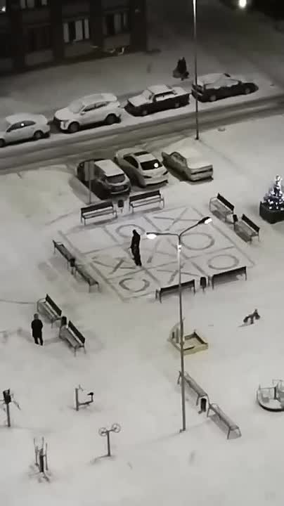 В Балашихе папа с сыном устроили битву в крестикинолики на заснеженном пятачке среди лавочек.