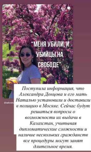 «Поступила информация, что Александра Донцова и его мать Наталью установили и доставили в полицию в Москве. Сейчас будут решаться вопросы о возможности их выдачи в Казахстан...» — говорится в публикации.