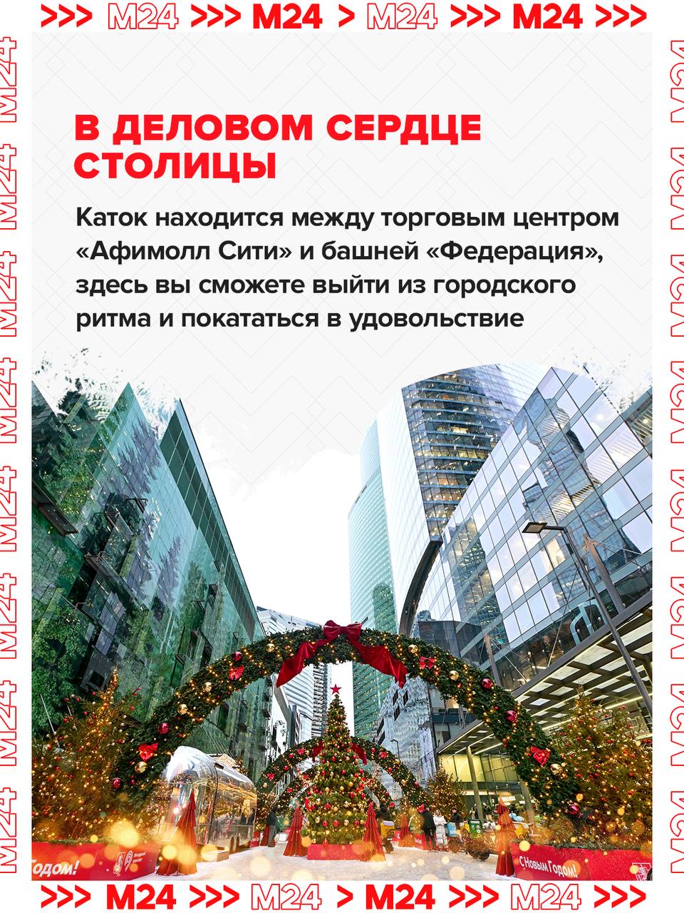 В пешеходной зоне «Москва-Сити» заработал бесплатный каток, прямо среди небоскрёбов. Его площадь — 240 кв. м, а современная трубная система поддерживает идеальное качество льда даже при плюсовой температуре.