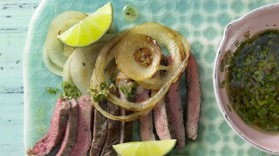 Чеснок очистить и мелко нарезать. Чили вымыть, разрезать вдоль, удалить семена и также нарезать. Лаймы разрезать пополам и отжать сок, отложив 50 мл.Смешать масло канолы с одной столовой ложкой оливкового масла. Обжарить чеснок на среднем огне до легкого золотистого цвета, после чего добавить приготовленный чили, сок лайма, тмин, соль и перец. Увеличить огонь и довести до кипения.Соус вылить в отдельную миску и дать немного остыть. Затем промыть кориандр, измельчить и добавить в соус, приправить по вкусу.Стейки промыть, высушить и посолить с перцем. Разогреть оставшееся оливковое масло в сковороде и обжарить стейки по 3-4 минуты с каждой стороны, пока они не приобретут хорошую золотистую корочку.Лук очистить и нарезать толстыми кольцами. Обжарить лук на сковороде по 2-3 минуты с каждой стороны, приправив солью и перцем.Стейки нарезать тонкими ломтиками, разложить на тарелках, полить острым соусом, гарнировать обжаренным луком и дольками лайма.Приятного аппетита! Этот рецепт позволит вам насладиться сочным и насыщенным вкусом ромштекса, который станет настоящим угощением для вас и ваших гостей!