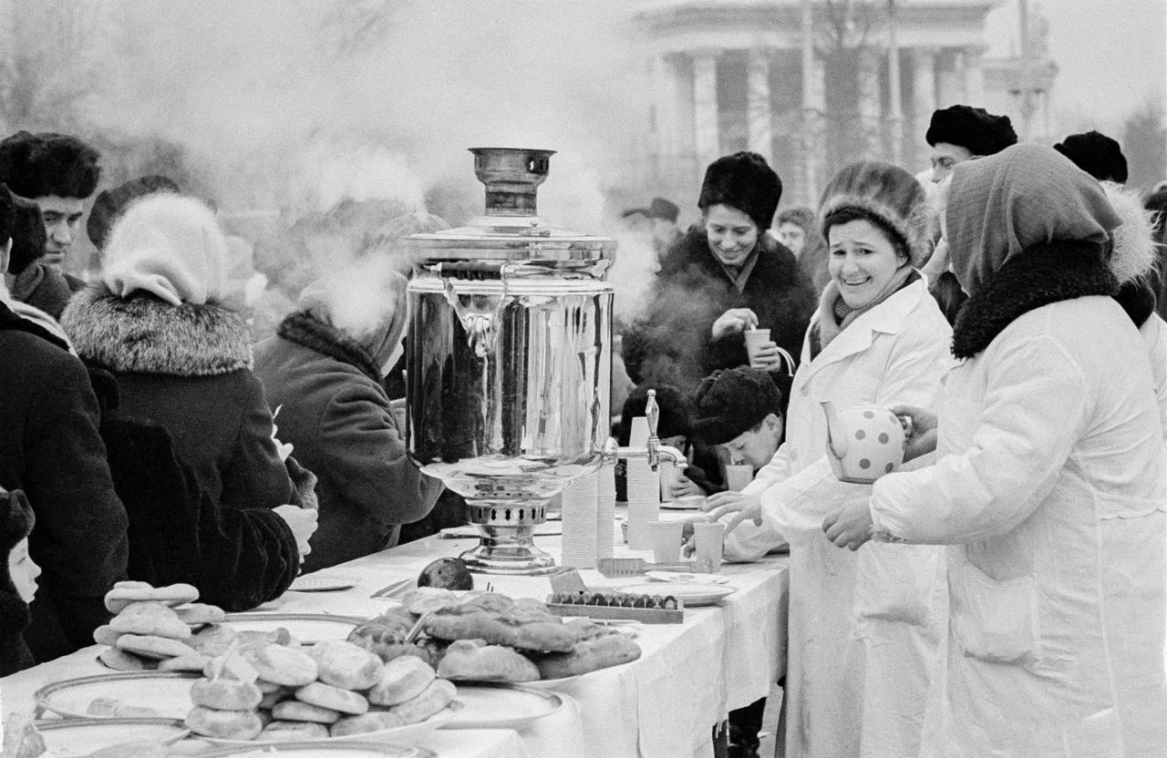 Фотофакт: чаепитие на празднике «Русская зима» на ВДНХ СССР. Москва. Январь 1971 г. Фото В.В. Ахломова. Главархив Москвы