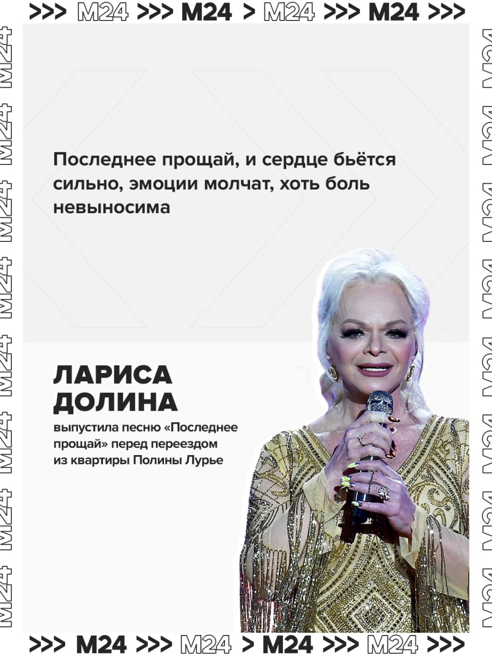Лариса Долина перед переездом выпустила грустную песню с символичным названием «Последнее прощай». Не знаем, кому (или чему) посвящена баллада, но по требованию Полины Лурье певица должна до 30 декабря освободить некогда свою пятикомнатную квартиру в Хамовниках.