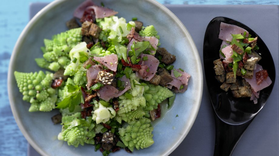 Лимон разрезать пополам, выжать сок и смешать его с горчицей и коричневым сахаром. Затем добавить 3 столовые ложки оливкового масла, а также соль и перец по вкусу. Тщательно перемешать венчиком.Капусту романеско очистить и разделить на соцветия. Вскипятить 250 мл подсоленной воды, добавить соцветия и варить под крышкой 8 минут. Затем отцеживать в дуршлаге.Переложить готовую романеско в салатник и замариновать в лимонном соусе, оставив на 15 минут.Петрушку хорошо промыть, обсушить, оторвать листья и мелко нарезать. Зеленый лук также нарезать. Вяленые помидоры и копченую ветчину нарезать на кубики.Хлеб нарезать на маленькие кубики, разогреть оставшееся оливковое масло в сковороде и обжарить хлеб до золотистой корочки.Когда романеско охладится, приправить солью и перцем. Смешать все ингредиенты: романеско, вяленые помидоры, ветчину, хрустящие кубики хлеба и зелень. Блюдо готово!Этот салат станет отличным дополнением к любому столу и удивит ваших гостей своей оригинальностью и вкусом. Приятного аппетита!