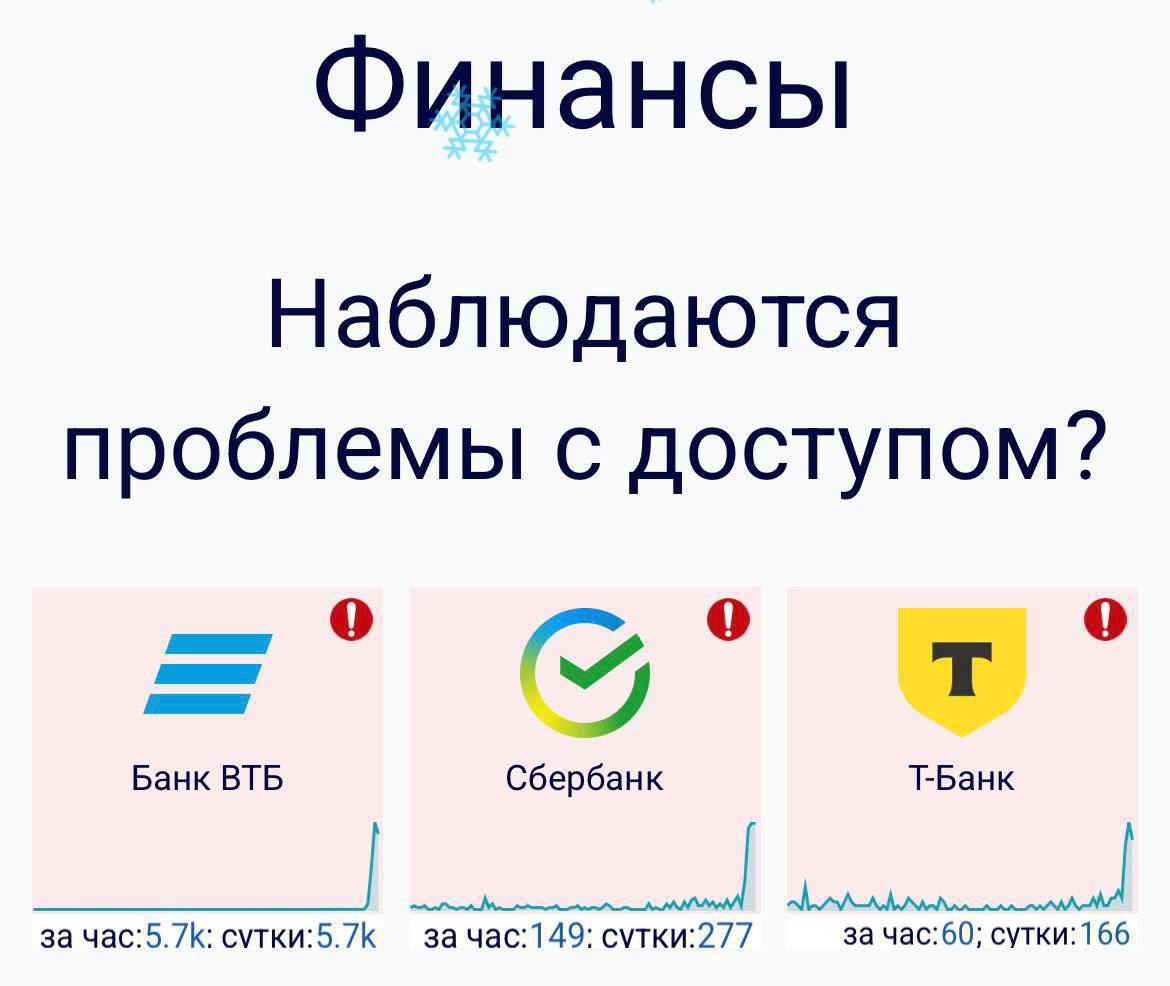 Они жалуются на невозможность проведения оплаты, входа в приложение и снятия наличных. По данным портала Detector404, за последний час о проблемах сообщили более 7,3 тыс. человек, а пик обращений пришелся на 13:30 по московскому времени.В основном...