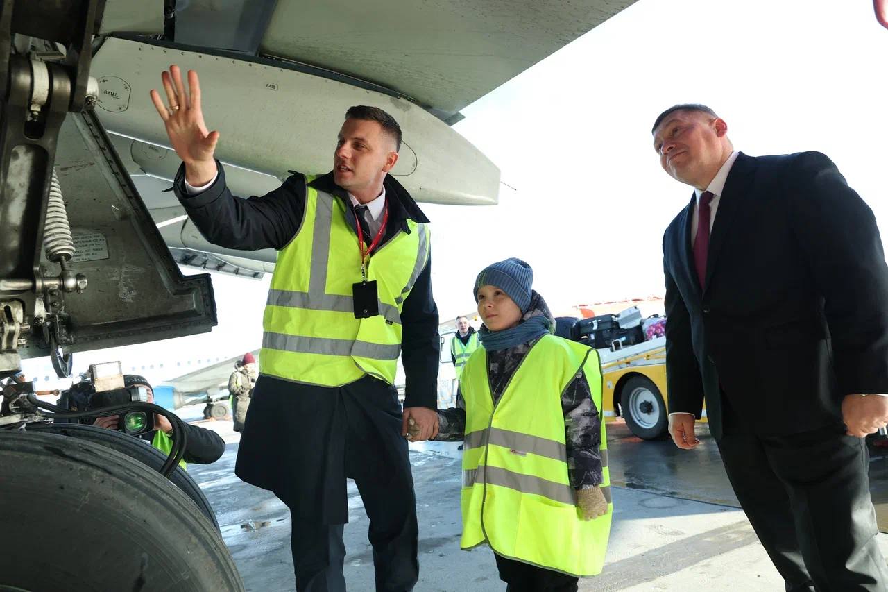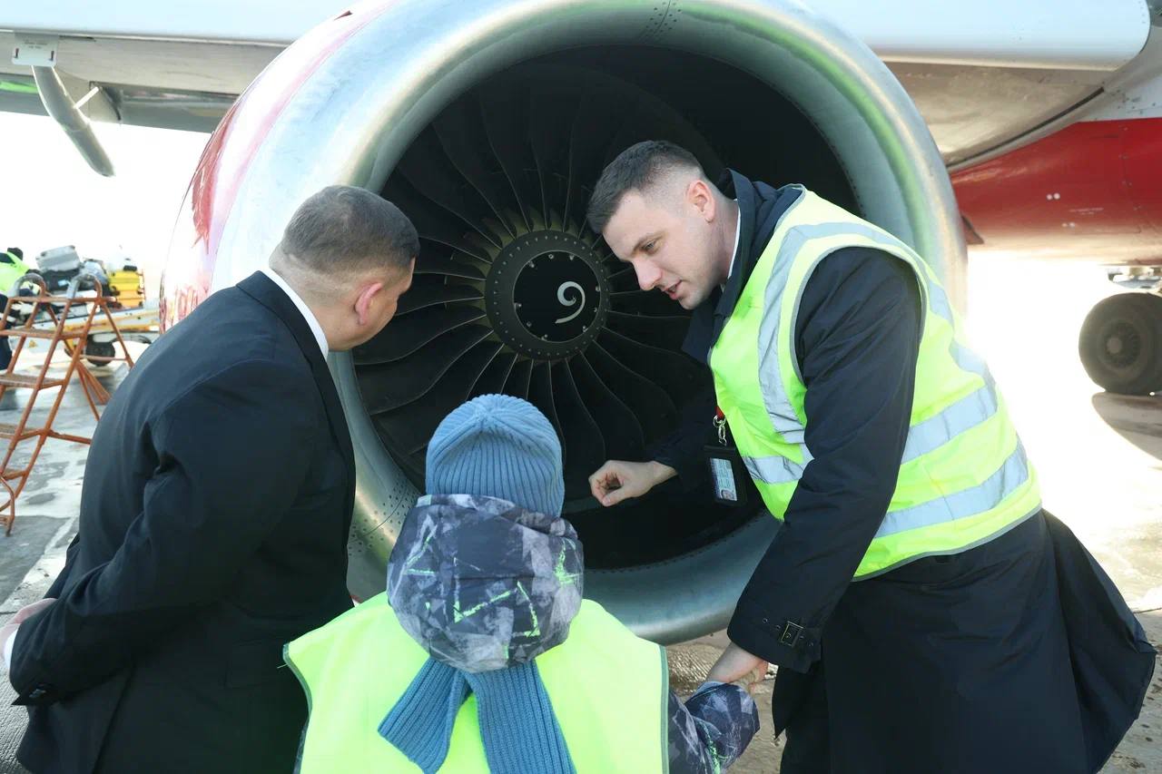 На перроне гостя ждал самолет Superjet-100 авиакомпании «Россия» – он только прибыл из Москвы и собирался в обратный рейс. Особенности предполетного осмотра Егору объясняли прямо в ходе подготовки воздушного судна. Вместе с мамой школьник побывал на борту, где командир воздушного судна Олег Кобылянский и второй пилот Дарья Рябоваобъяснили, как управлять самолетом и как работают его системы — гидравлическая и кондиционирования. Отметив большую заинтересованность Егора, экипаж пригласил его стать частью команды авиакомпании в будущем.