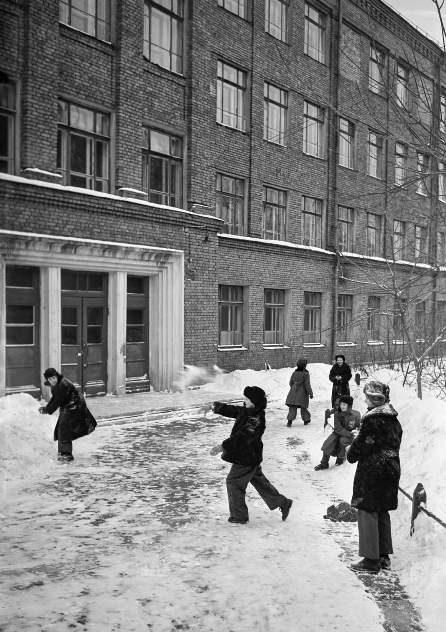 Фотофакт: Мальчики во время игры в снежки у здания Центральной музыкальной школы-десятилетки перед началом занятий. Москва. Февраль 1958 г. Фото Э. Евзерихина. Главархив Москвы