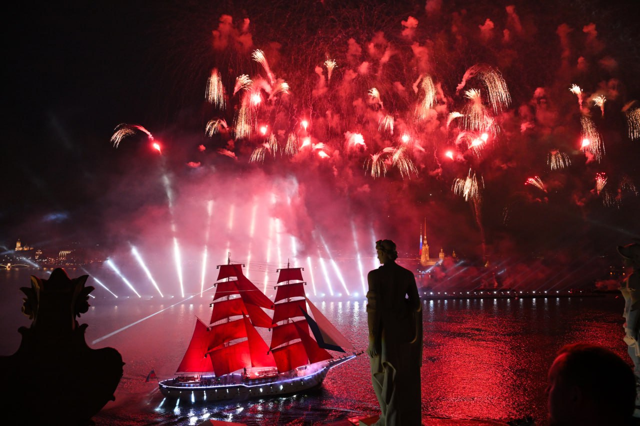 • Бриг «Россия» на реке Неве во время праздника выпускников «Алые паруса» в Санкт-Петербурге (Алексей Даничев / РИА Новости)