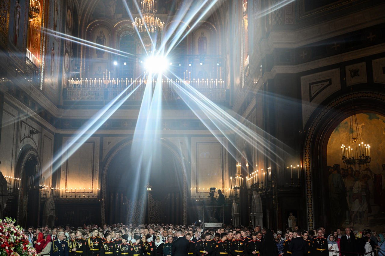 • Верующие на праздничном Пасхальном богослужении в храме Христа Спасителя в Москве (Рамиль Ситдиков / РИА Новости)