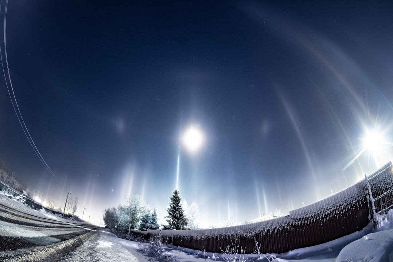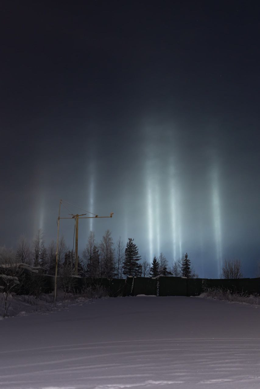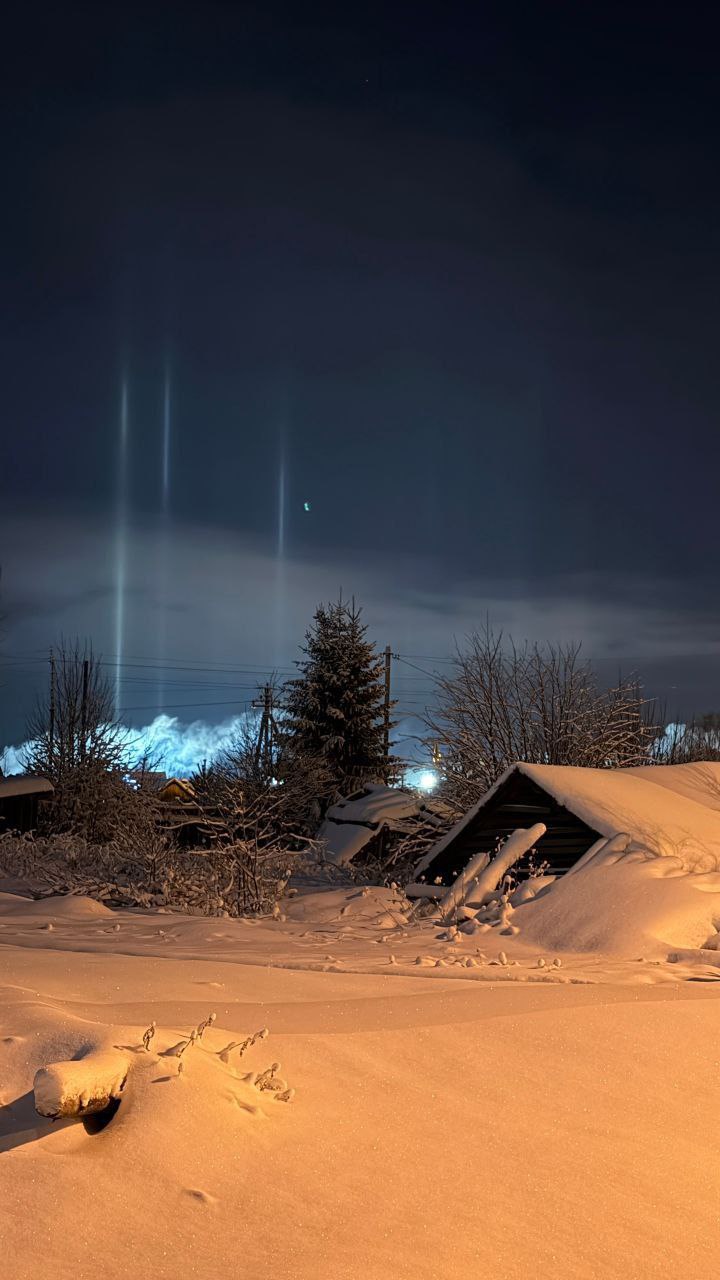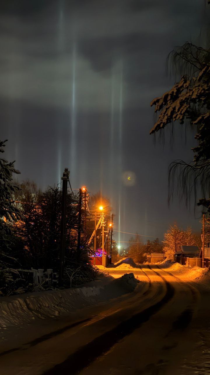 «В ночь с 1 на 2 января яркие световые столбы было видно сразу в нескольких регионах России. Особо удачливые соотечественники помимо вертикальных столбов запечатлели еще и лунное гало»
