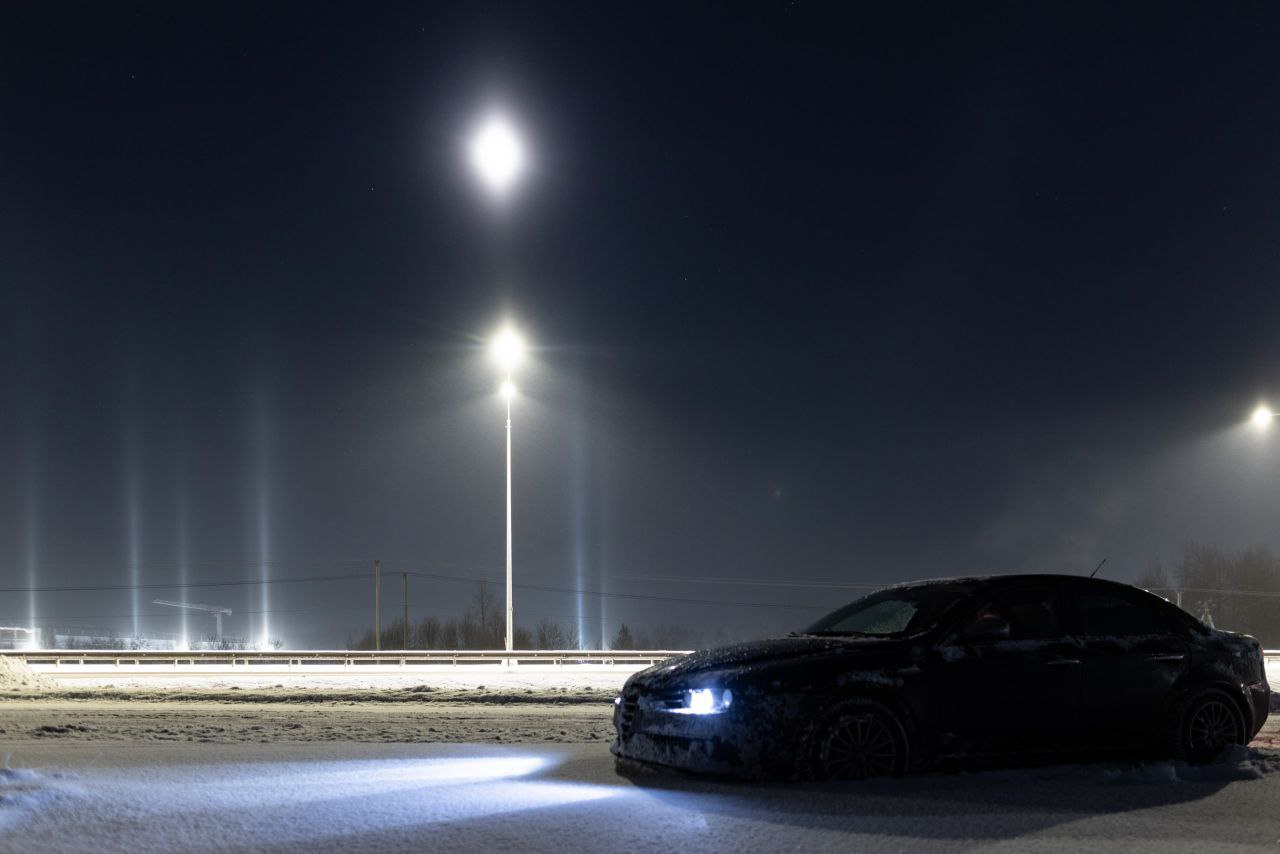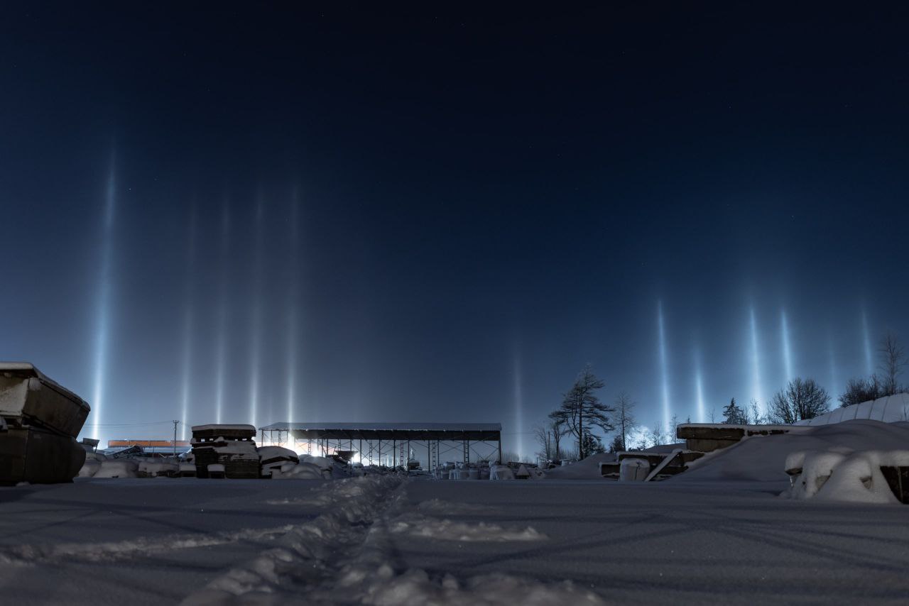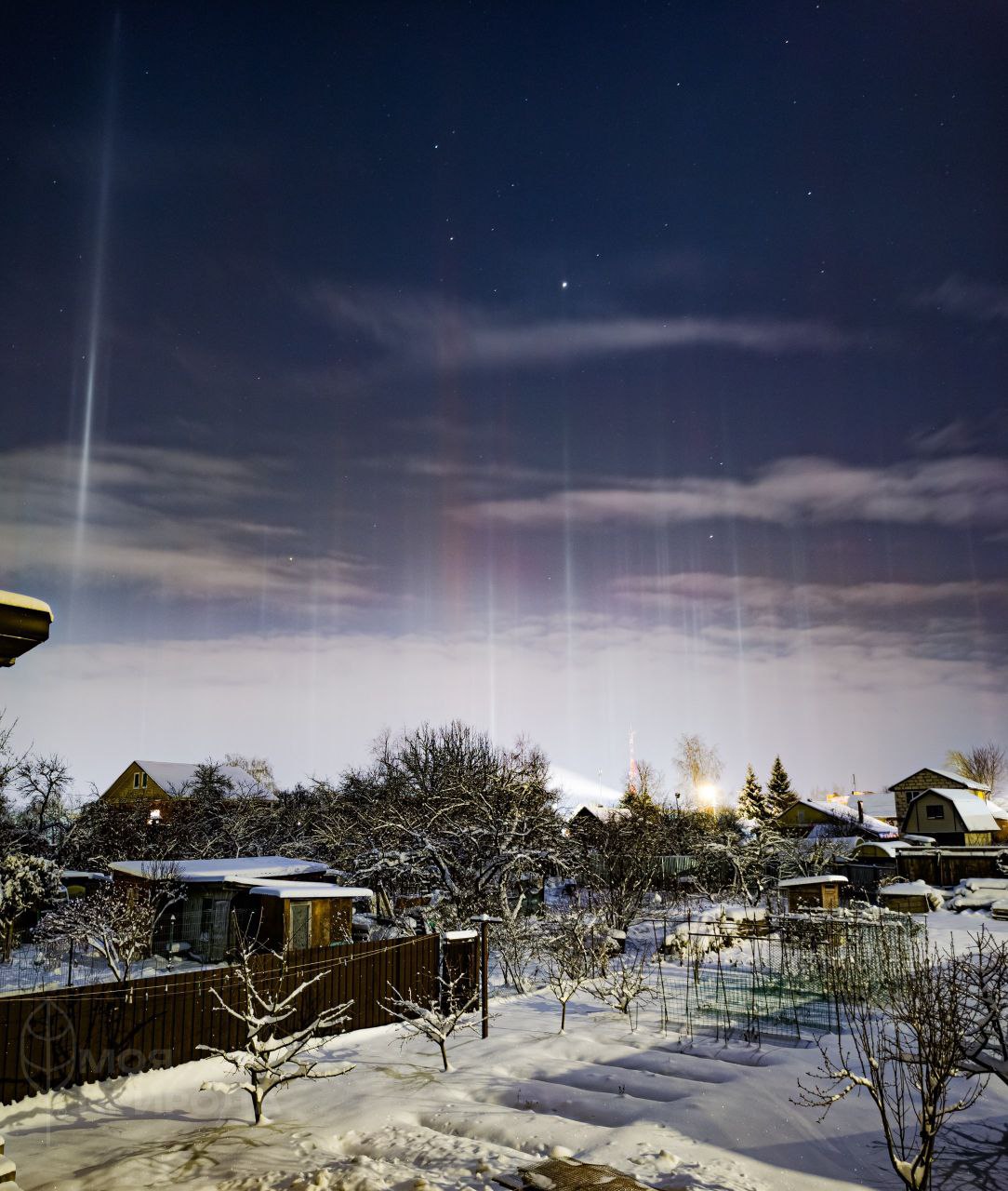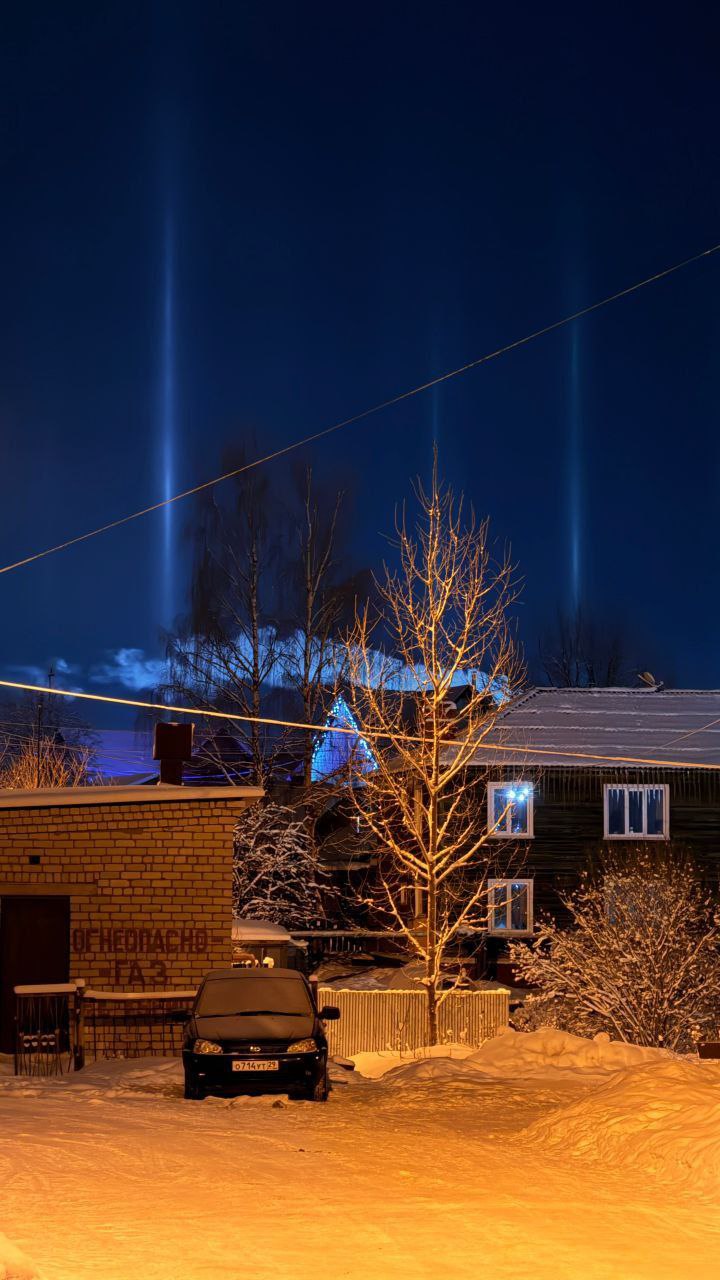 «В ночь с 1 на 2 января яркие световые столбы было видно сразу в нескольких регионах России. Особо удачливые соотечественники помимо вертикальных столбов запечатлели еще и лунное гало»
