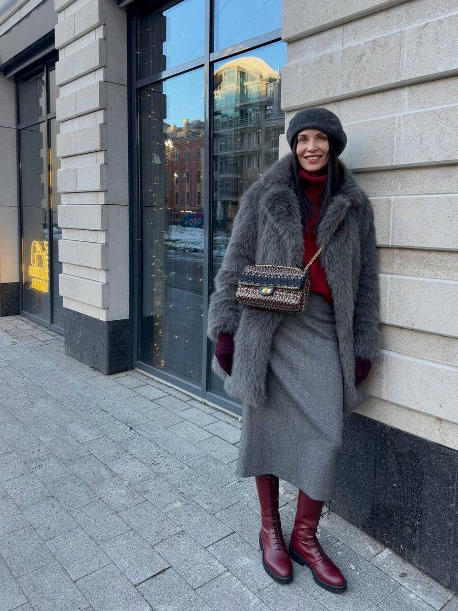 1. Стильное сочетание вишневого свитера с жемчужно-серой юбкой и темно-серой пушистой шубой чуть ниже середины бедра создаст впечатление яркости и оригинальности. Для акцента подойдут бордовые кожаные сапоги и перчатки.