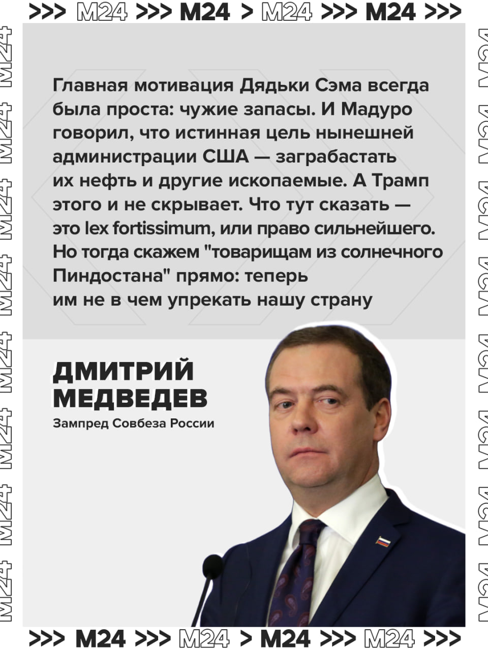 Дмитрий Медведев прокомментировал ТАСС операцию США в Венесуэле. Запред Совбеза назвал поведение Трампа противоправным, при этом отметил: американский лидер и его команда отстаивают — пусть и весьма жёстко — национальные интересы.