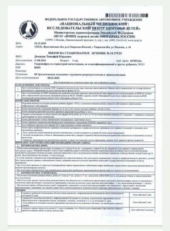 Обращается за помощью мама ДЕМИДОВА ЛЮБОВЬ НИКОЛАЕВНА. Родила сына (Тимофей) он родился с одной почкой. Вторая не развилась до конца она не (рабочая.)