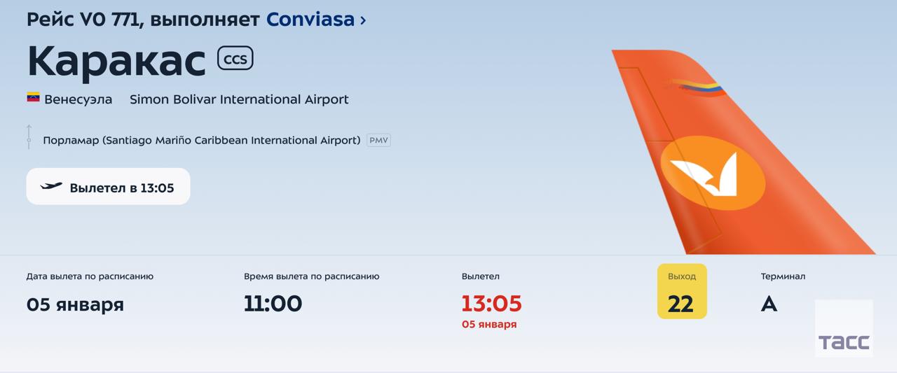 Самолет авиакомпании Conviasa вылетел из Москвы в Каракас, следует из онлайн-табло аэропорта Внуково.