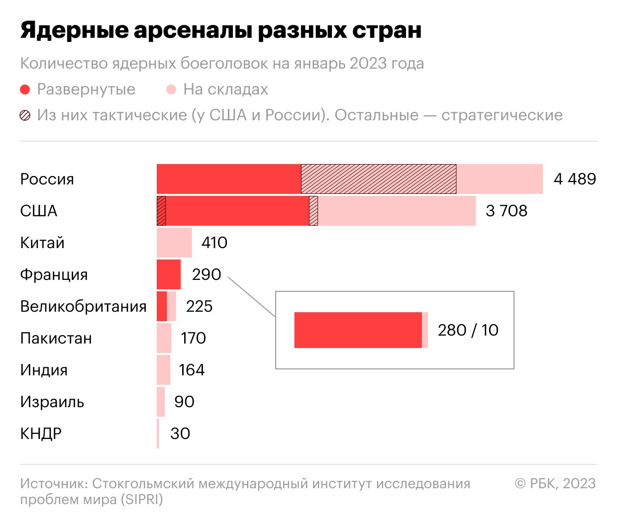 Согласно данным Стокгольмского международного института исследований проблем мира, в январе 2025 года общее число ядерных боеголовок в мире составило 9614. В арсенале России насчитывается порядка 4,4 тыс. ядерных боеголовок, в то время как США располагают 3,7 тыс. единиц.
