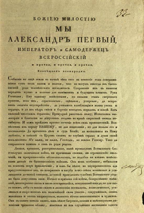 25 декабря 1812 года (6 января 1813 года по новому стилю) император Александр I официально объявил: Отечественная война закончилась.