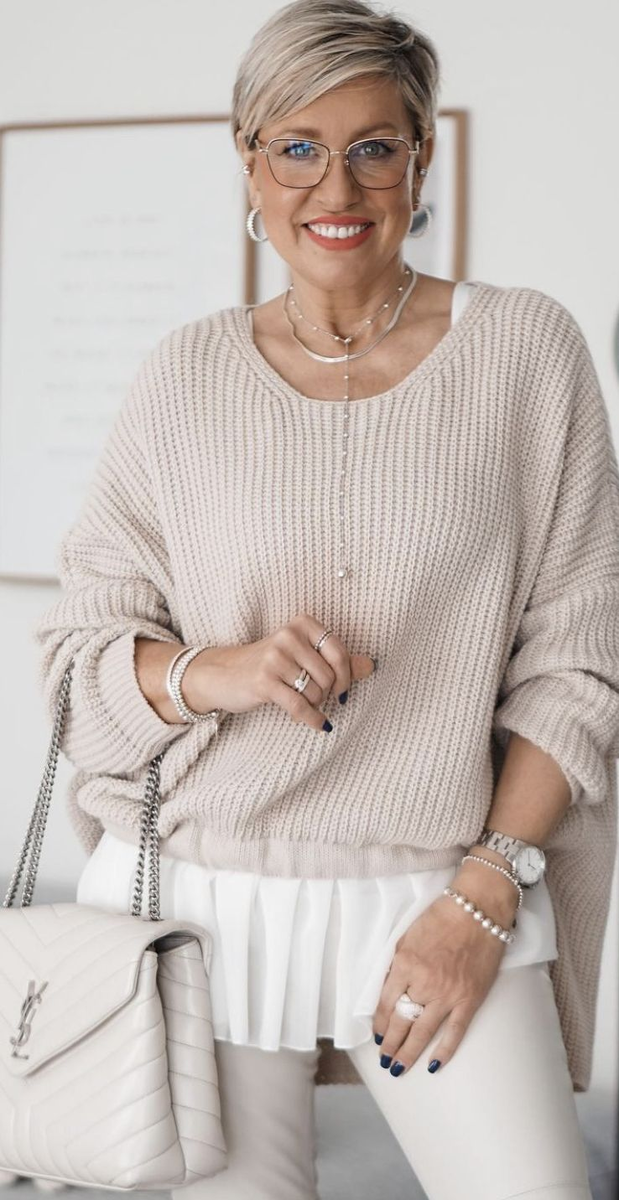 В топе вязаных вещей для женщин 50+ уже несколько сезонов — это свитера, кардиганы и платья. Эти предметы стали must-have осеннего гардероба, ведь они обеспечивают не только тепло, но и комфорт. Так, свитера в нейтральных тонах, таких как серый, кремовый и темно-синий, присутствуют в каждой коллекции. Для более смелых модниц подойдут яркие цвета и оригинальные текстуры с косым узором или ребристой вязкой. Удачно подобранный свитер может корректировать силуэт, создавая гармоничный образ.