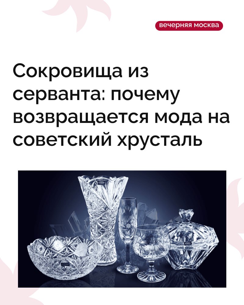 Советский хрусталь — особый культурный феномен. Почти в каждой семье были салатники, розетки и фужеры, выставляемые только по праздникам. Производством хрусталя в СССР славился завод в Гусь-Хрустальном, и почти каждый дом мог похвастаться своими «сверкающими» бокалами.