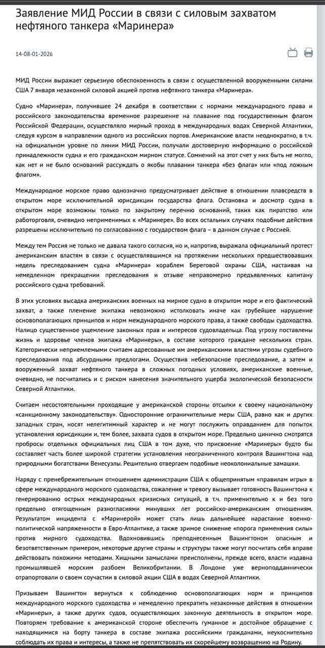 Россия заявила об угрозе ухудшения отношений с США из-за захвата танкеров, а также прогнозирует, что подобных инцидентов может стать больше.