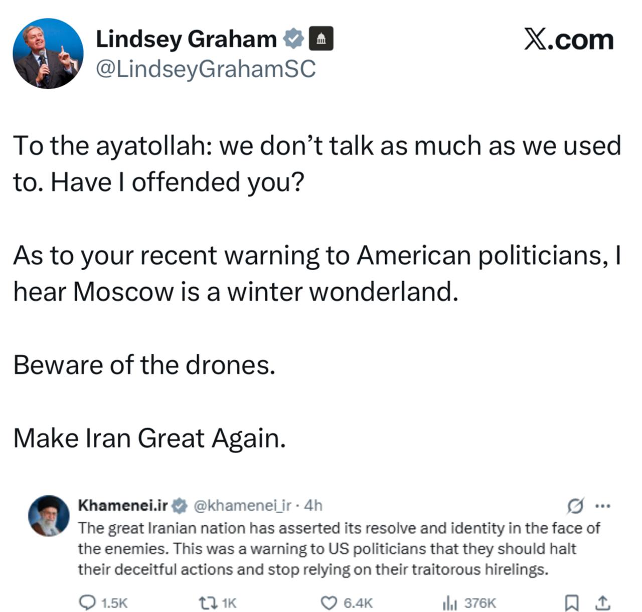 Обращаясь к аятолле: мы уже не так много разговариваем, как раньше. Я вас не обидел? Что касается вашего недавнего предупреждения американским политикам, я слышал, что Москва - это зимняя страна чудес. Остерегайтесь беспилотников. Сделайте Иран снова великим.
