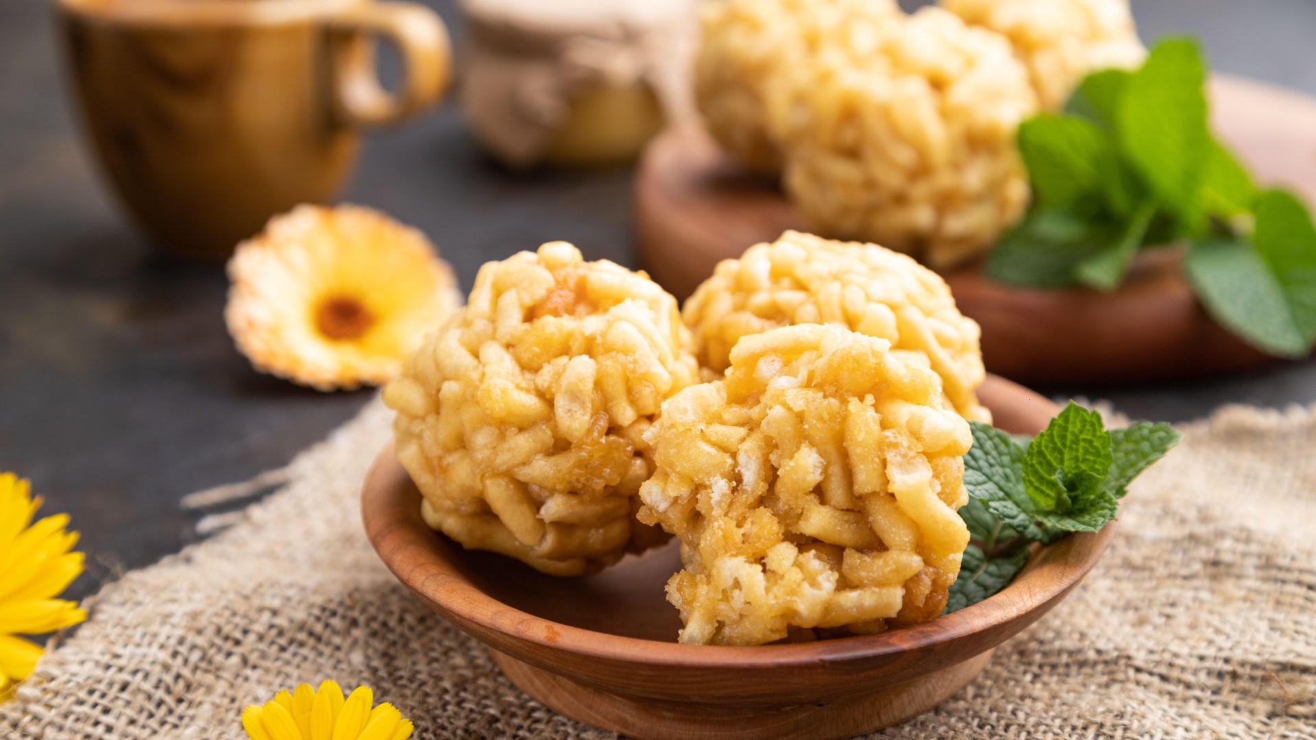 В миску насыпьте шарики и добавьте к ним измельченные орехи. Влейте к ингредиентам мед и тщательно перемешайте.
