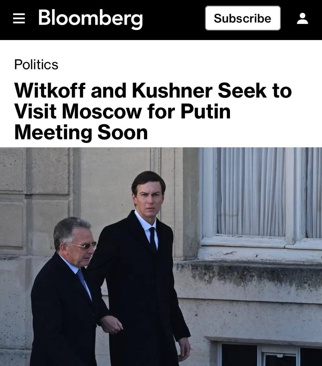 «Уиткофф и Кушнер планируют в ближайшее время посетить Москву для встречи с Путиным»: По информации Bloomberg, Уиткофф и Кушнер снова едут в Москву к Путину.