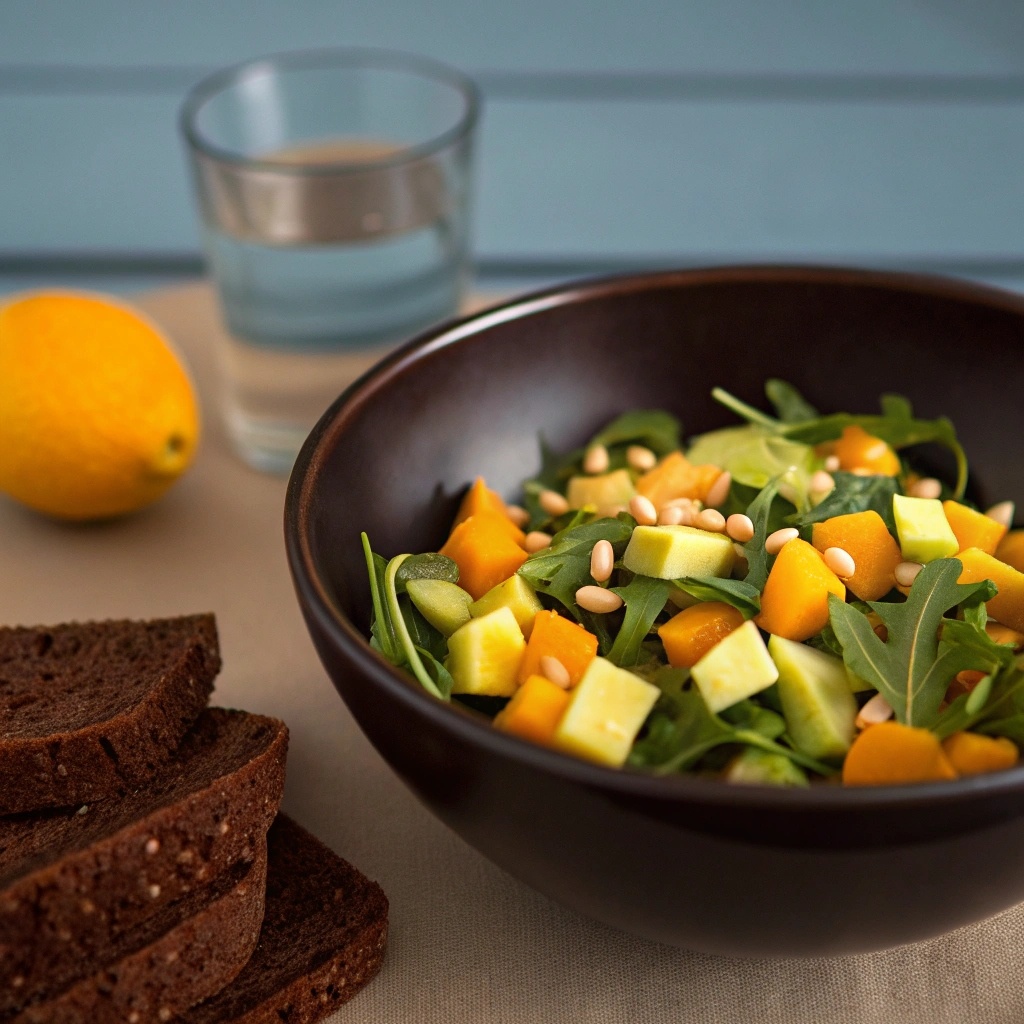 - Салат с рукколой, авокадо и кедровыми орешками: идеальное сочетание свежести рукколы, кремовости авокадо и хрустящих кедровых орехов.