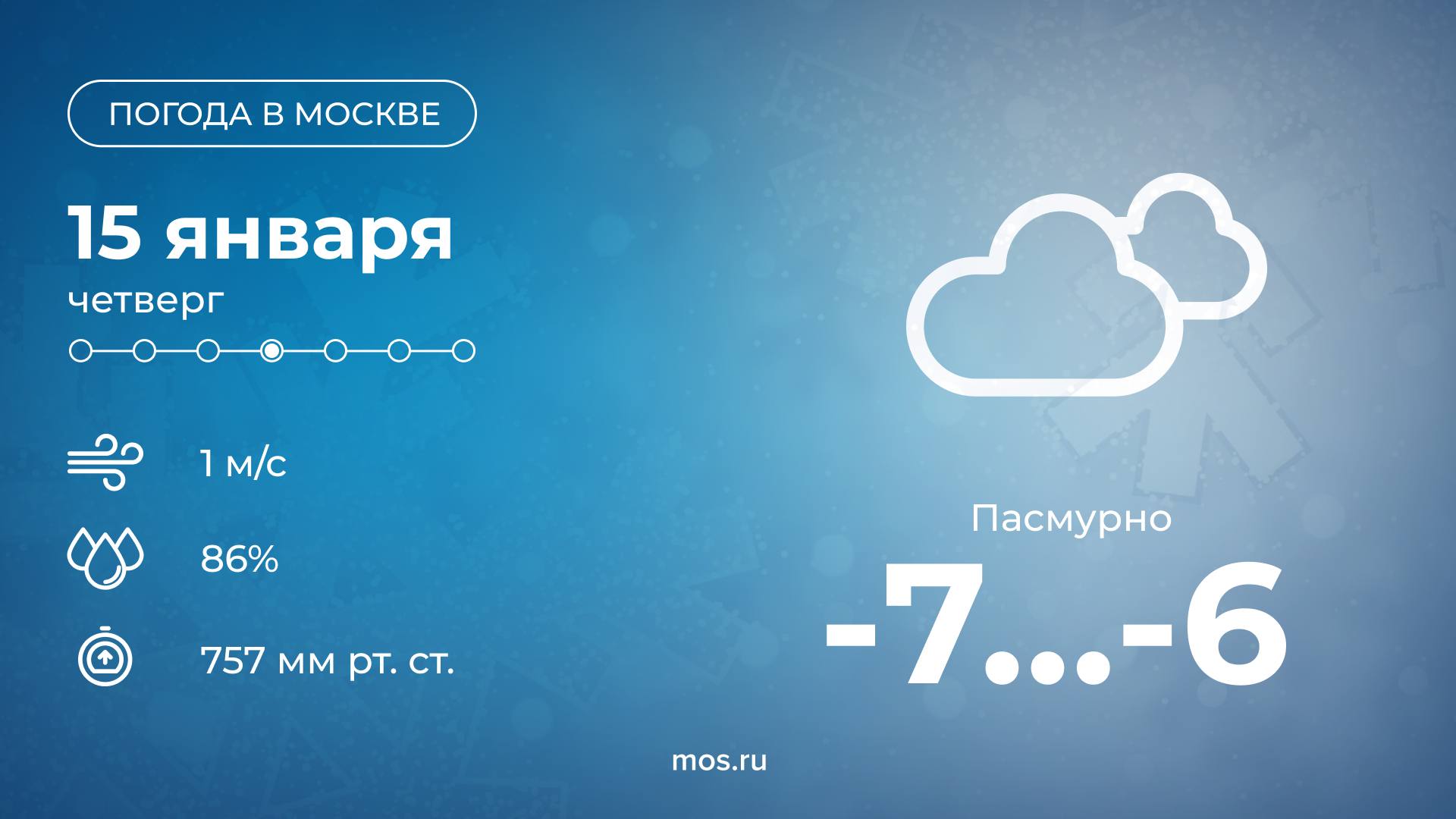 Доброе утро! Сегодня в Москве будет пасмурная погода. Столбики термометров покажут от 7 до 6 °С. Одевайтесь теплее!