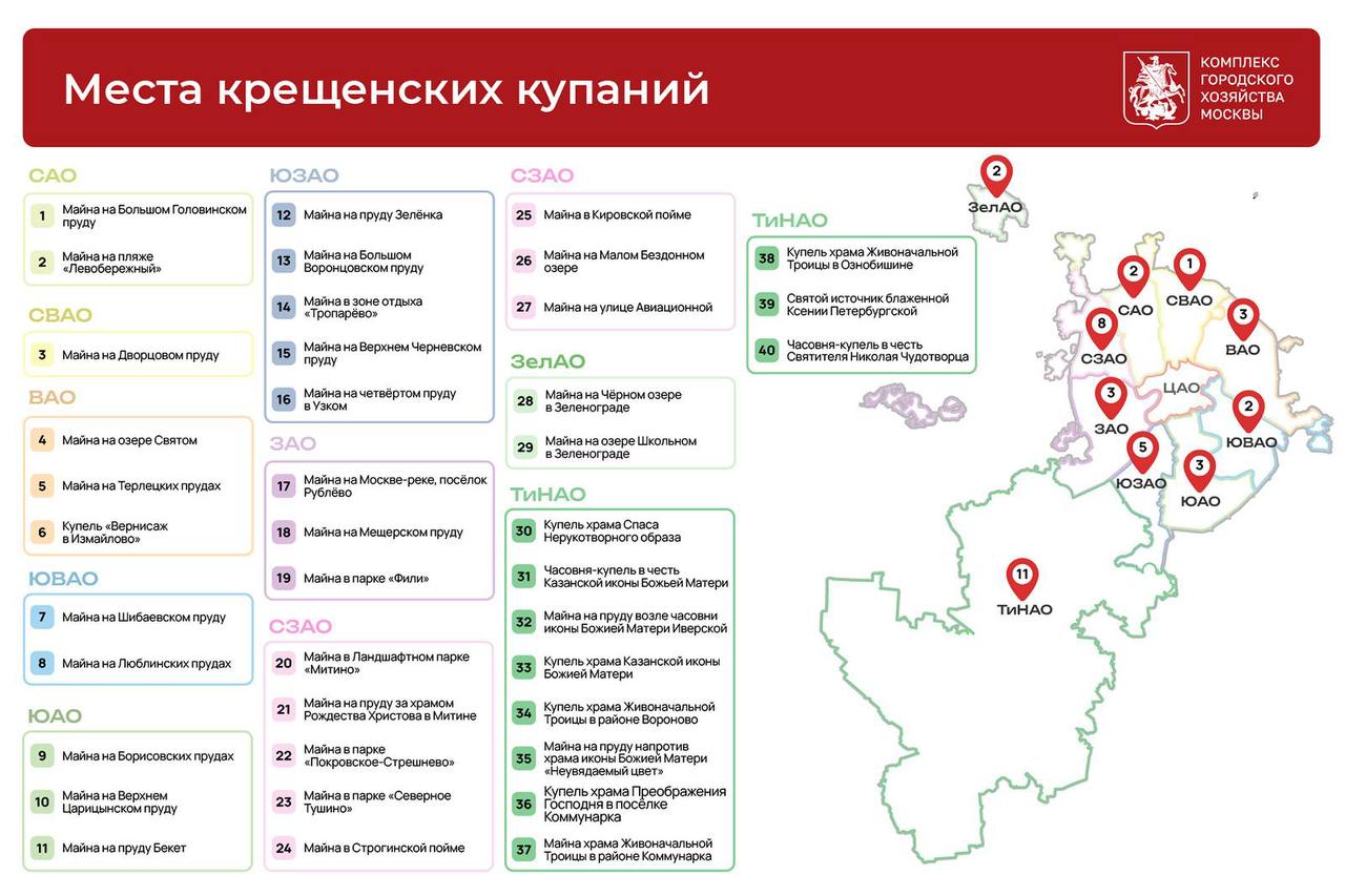 К Крещению в Москве оборудовали 40 специальных площадок для купаний. Купели откроются 18 января в 18:00 и будут работать до 18:00 19 января. Они расположены в разных округах столицы. Ознакомиться с полным списком адресов можно по ссылке или на карте. Во всех пунктах будут работать медики и спасатели.