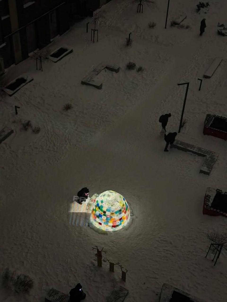 Для создания иглу он вытащил на улицу контейнеры с водой и пищевые красители.