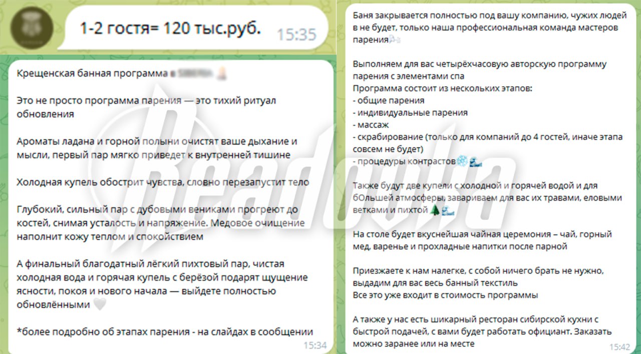 К празднику Крещения Господня некоторые московские спа-отели подготовили VIP-программы с бешеным ценником. За 120 тыс гостям предлагают 4-х часовое закрытое посещение бани с авторскими процедурами, две специально «заваренные» травами купели (холодную и горячую), чайную церемонию и обслуживание в ресторане. В стоимость также входит весь необходимый банный текстиль.