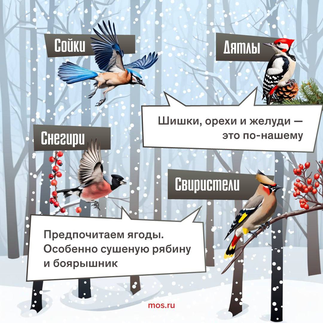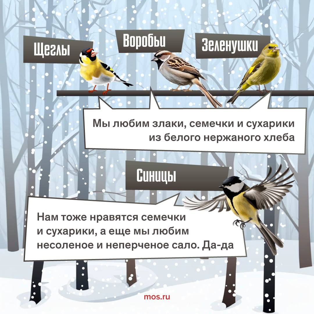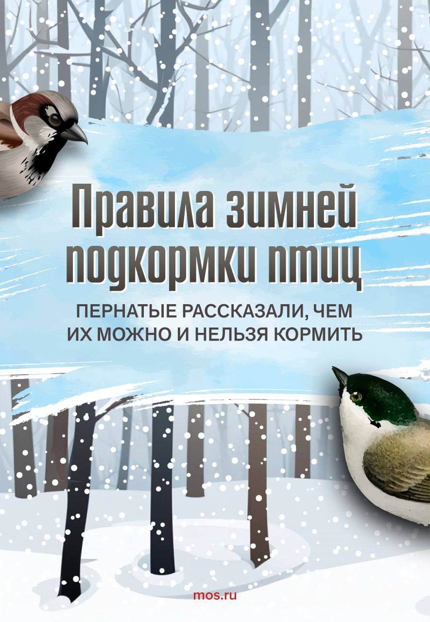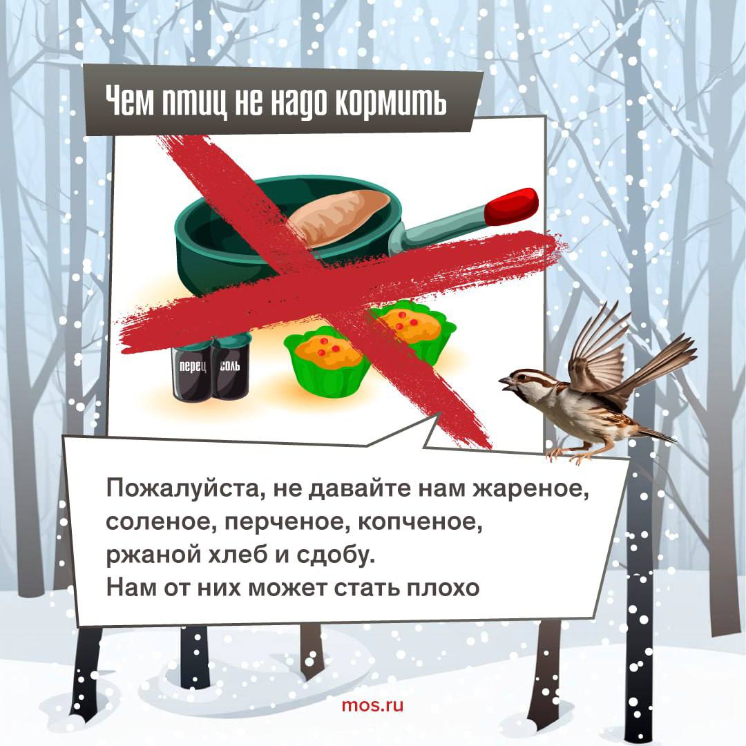 Кроме того, пернатым можно предлагать семена подсолнечника, зерно и сушеные ягоды рябины. Подкармливать птиц важно регулярно, особенно во время сильных снегопадов и морозов. Если вы увидели животное, которое нуждается в помощи, сообщите об этом в единую справочную службу Правительства Москвы по телефону: +7 495 777-77-77.