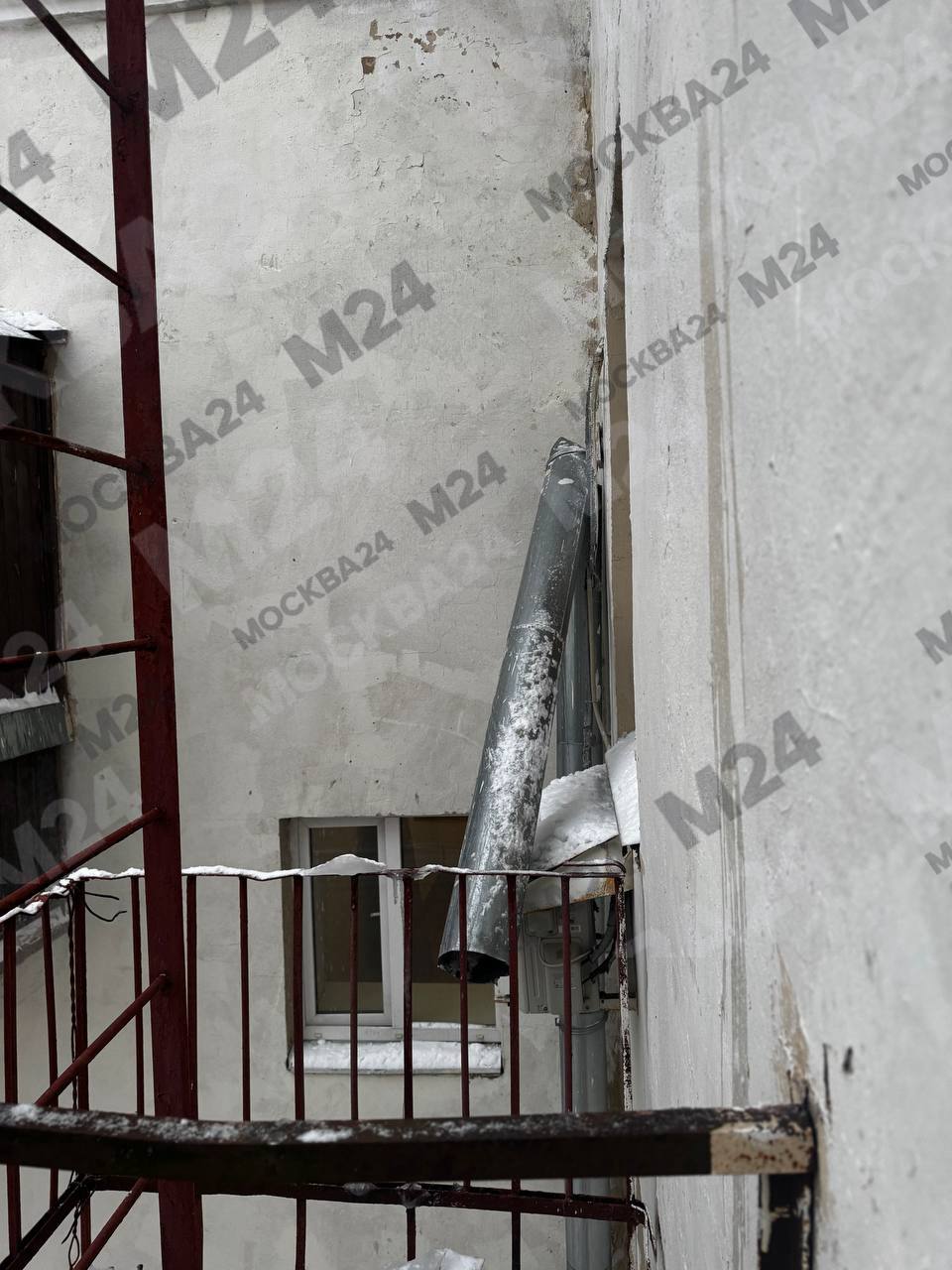 В доме №11 во время субботней чистки крыши была повреждена водосточная труба. Конструкция приземлилась на кондиционер и застряла на высоте восьмого этажа, рассказали соседи.