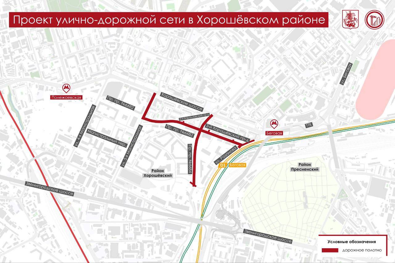 В частности, здесь реконструируют участок улицы Розанова и 3-й Хорошевский проезд, сделают дополнительный выезд в сторону Хорошевского шоссе и станции метро «Беговая», а также построят два новых проезда. Кроме того, специалисты обновят съезды на пересечении с шоссе, установят остановки городского транспорта и оснастят дороги пешеходными переходами и велодорожками.