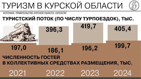 Статистику по турпотоку в облправительстве раскрыли «Ъ-Черноземье» только за 2022-2024 годы. По итогам первого года СВО он составлял в Курской области 396,3 тыс. человек, в 2023-м увеличился до 419,7 тыс. человек. В 2024-м на фоне вторжения ВСУ в Суджу турпоток сократился, но остался выше уровня 2022 года — 405,4 тыс. человек.