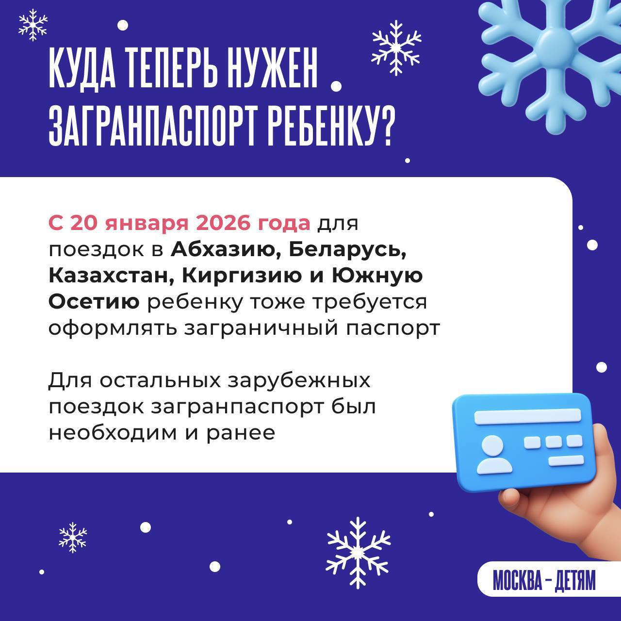 С 20 января для выезда из РФ в ряд стран детям до 14 лет потребуется загранпаспорт. Ранее достаточно было свидетельства о рождении. На портале mos.ru работает спецпроект, который поможет оформить документ быстро и без ошибок.