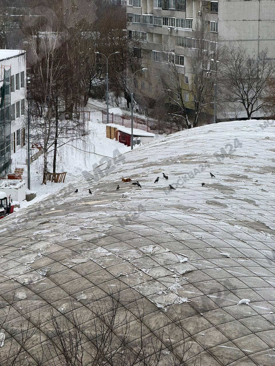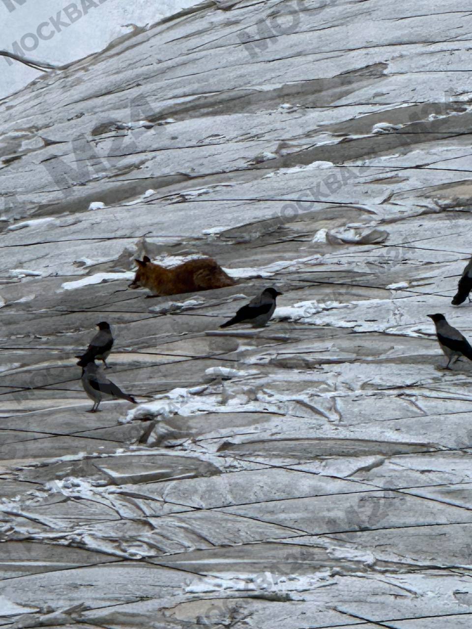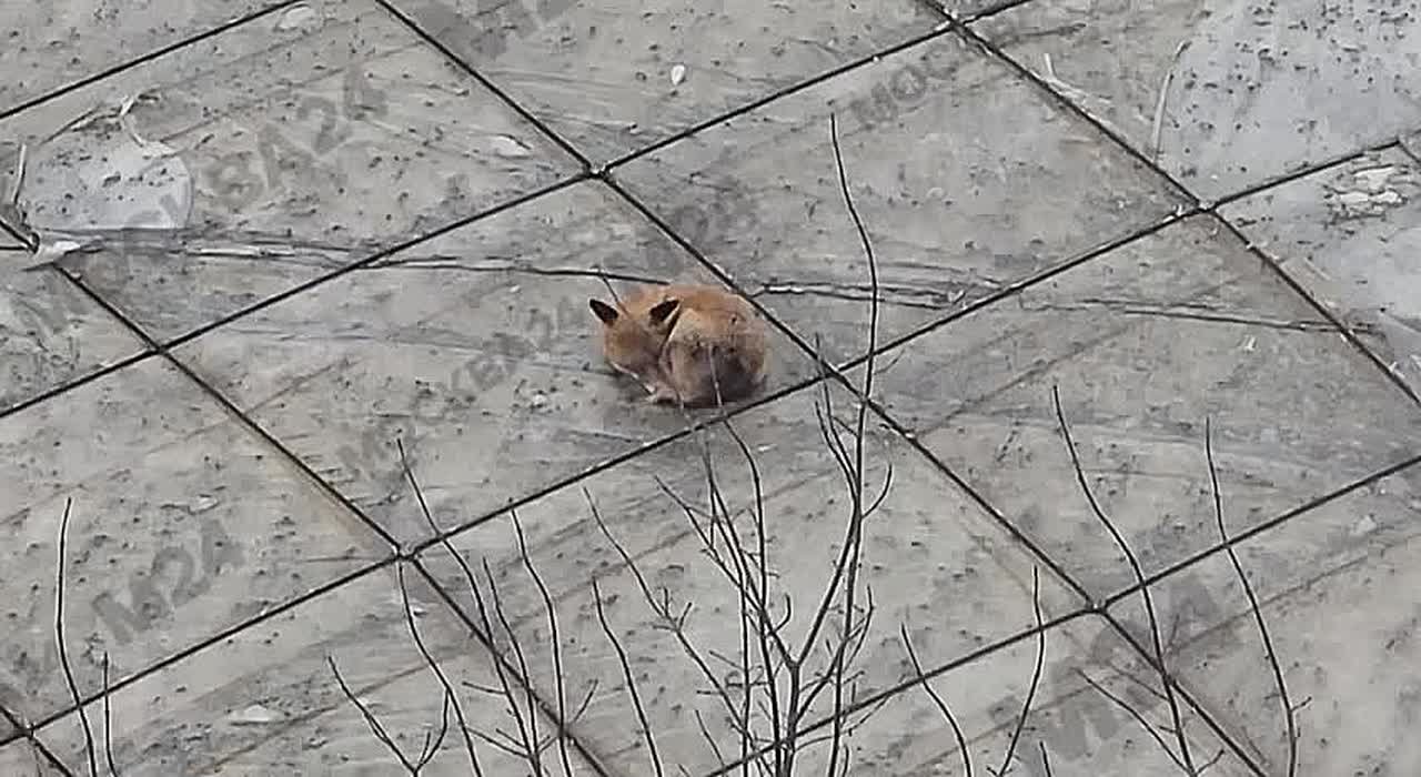 Бедолага совсем уже выбилась из сил. По нашей информации, лиса сидит на крыше теннисного клуба почти пять часов и не может спуститься. Даже на компанию ворон не реагирует.