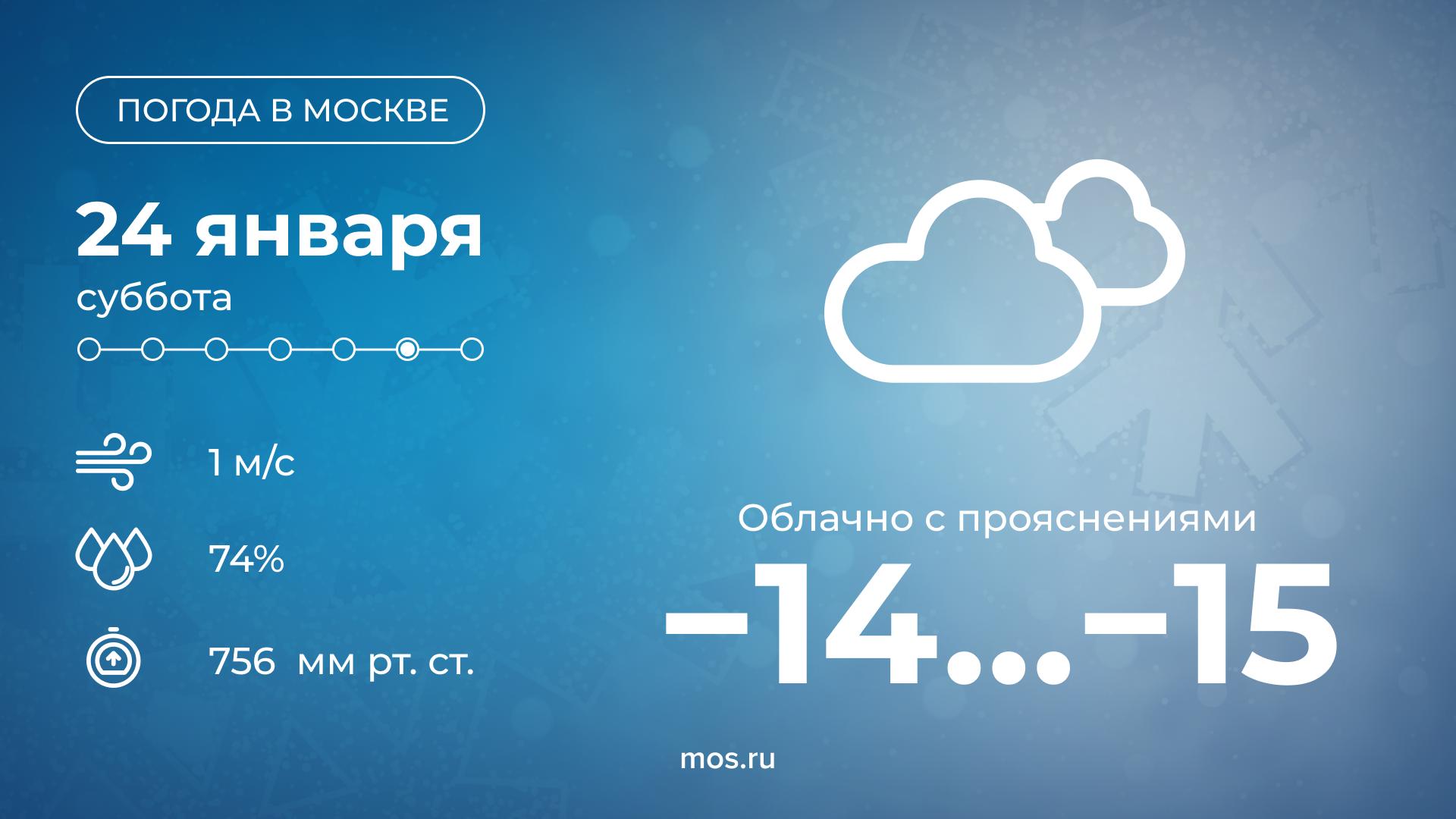Доброе утро! Сегодня в Москве будет облачная погода. Столбики термометров днем покажут от 14 до 15 °С. Вечером температура воздуха опустится до 20 °С. Одевайтесь теплее!