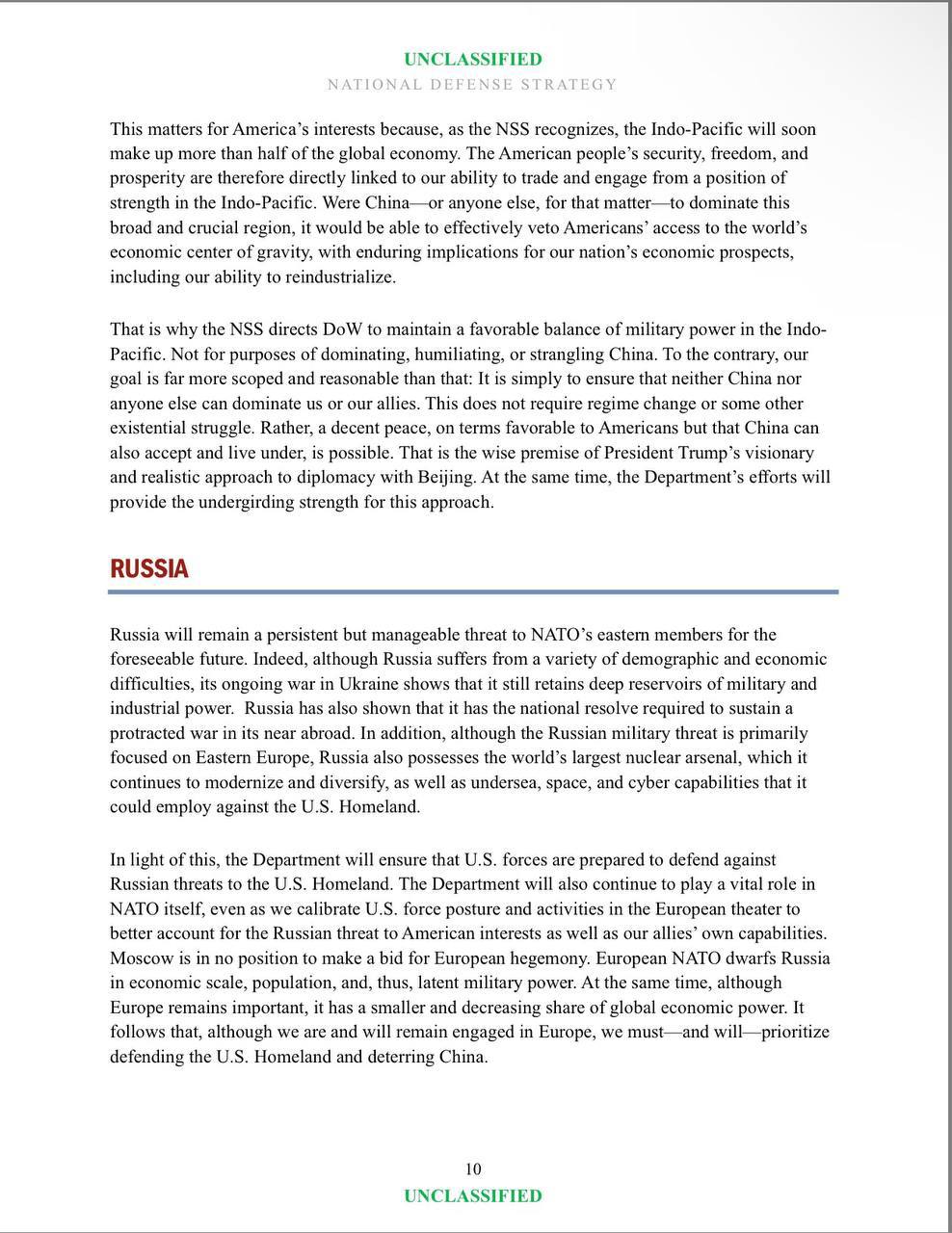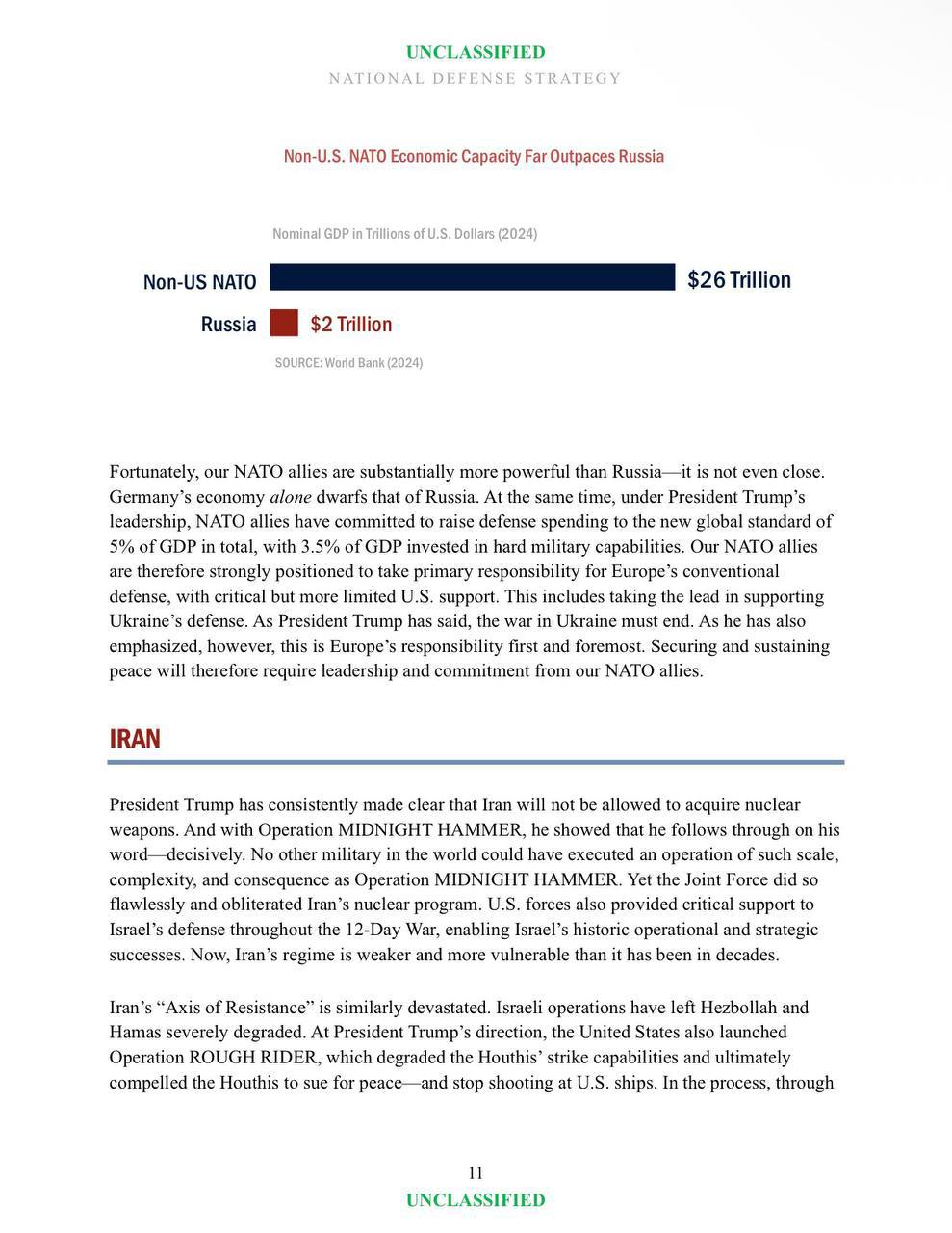 В соответствии со Стратегией национальной обороны Министерства обороны США на 2026 год, Россия "будет оставаться постоянной, но управляемой угрозой для восточных членов НАТО в обозримом будущем... Министерство будет обеспечивать готовность американских войск к защите от российских угроз территории США. Министерство также будет продолжать играть жизненно важную роль в самом НАТО, даже когда мы корректируем позицию и действия американских сил на европейском театре военных действий, чтобы лучше учитывать российскую угрозу американским интересам, а также собственные возможности наших союзников. Москва не в состоянии претендовать на гегемонию в Европе. Европейское НАТО намного превосходит Россию по экономическому масштабу, населению и, следовательно, потенциальной военной мощи... Хотя мы и будем продолжать участвовать в европейских делах, мы должны и будем уделять приоритетное внимание защите территории США и сдерживанию Китая. К счастью, наши союзники по НАТО значительно сильнее России — даже близко не сравнится. Только экономика Германии намного превосходит российскую. В то же время, под руководством президента Трампа союзники по НАТО обязались увеличить расходы на оборону до нового глобального стандарта в 5% ВВП, при этом 3,5% ВВП будут инвестированы в военный потенциал. Поэтому наши союзники по НАТО находятся в сильной позиции, чтобы взять на себя основную ответственность за обычную оборону Европы при критической, но более ограниченной поддержке США. Это включает в себя ведущую роль в поддержке обороны Украины".