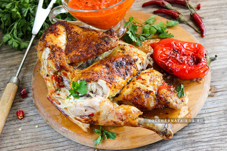 Сначала курицу нужно разрезать вдоль позвоночника и удалить лишний жир. Обильно посолить и поперчить, затем смазать растительным маслом. Оставить мариноваться не менее трех часов, а лучше — на всю ночь.