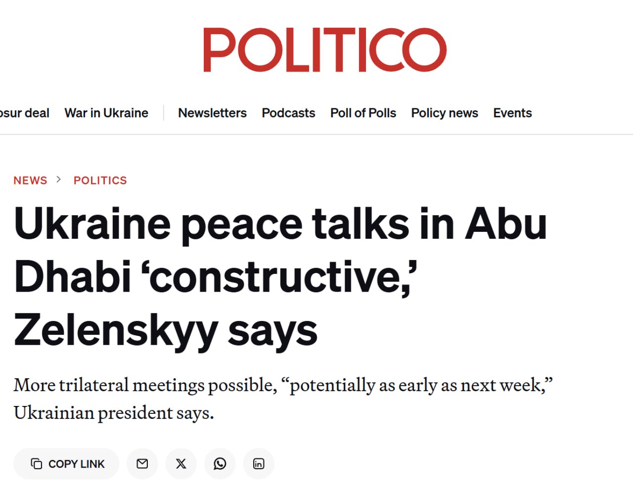 Politico: Зеленский заявил, что мирные переговоры по Украине в Абу-Даби «конструктивны» и сообщил о возможности проведения новых трехсторонних встреч, «потенциально уже на следующей неделе».