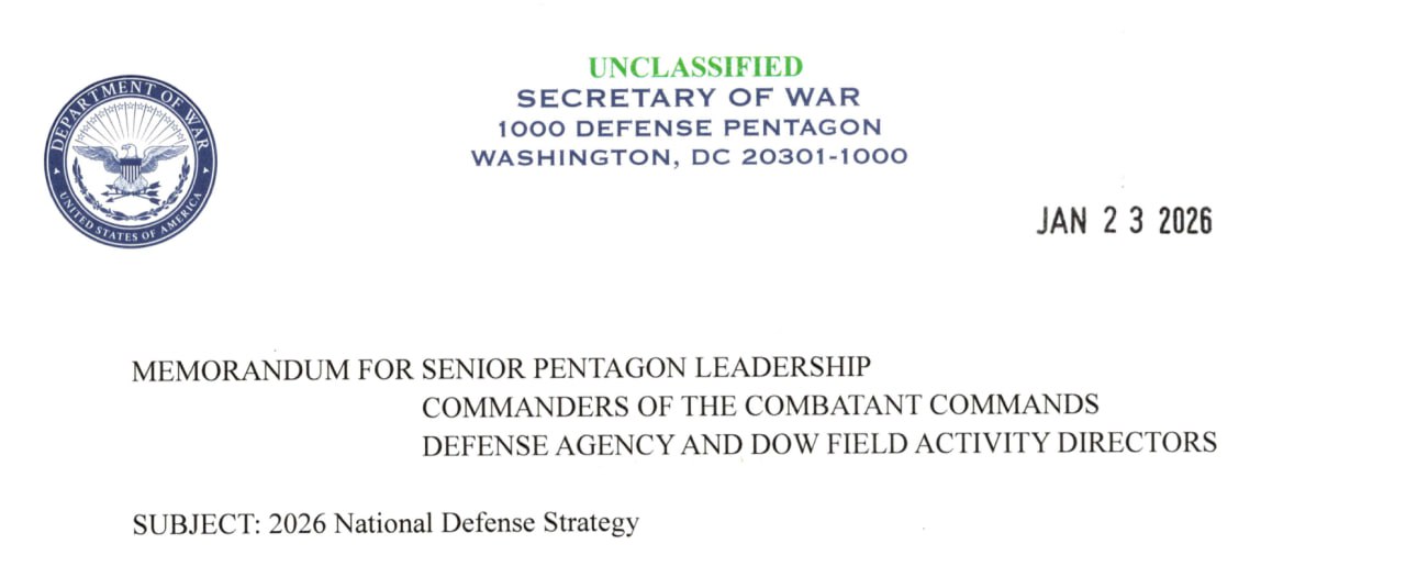 Министр войны США Пит Хегсет 23 января 2026 года издал меморандум «Стратегия национальной обороны 2026» (2026 NDS). Документ провозглашает что «Америка прежде всего» через