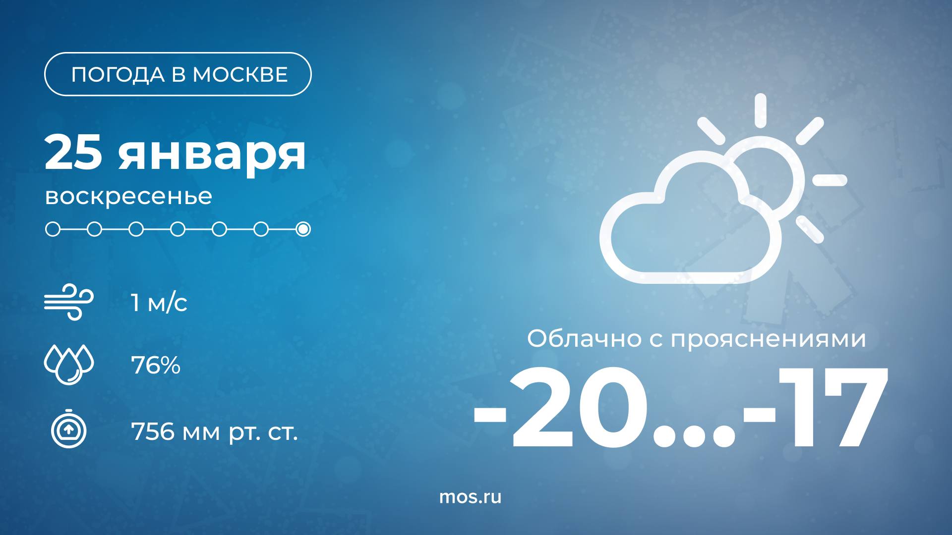 Доброе утро! Сегодня в столице будет облачная погода. Столбики термометров днем покажут от 17 до 20 °С. Одевайтесь теплее!