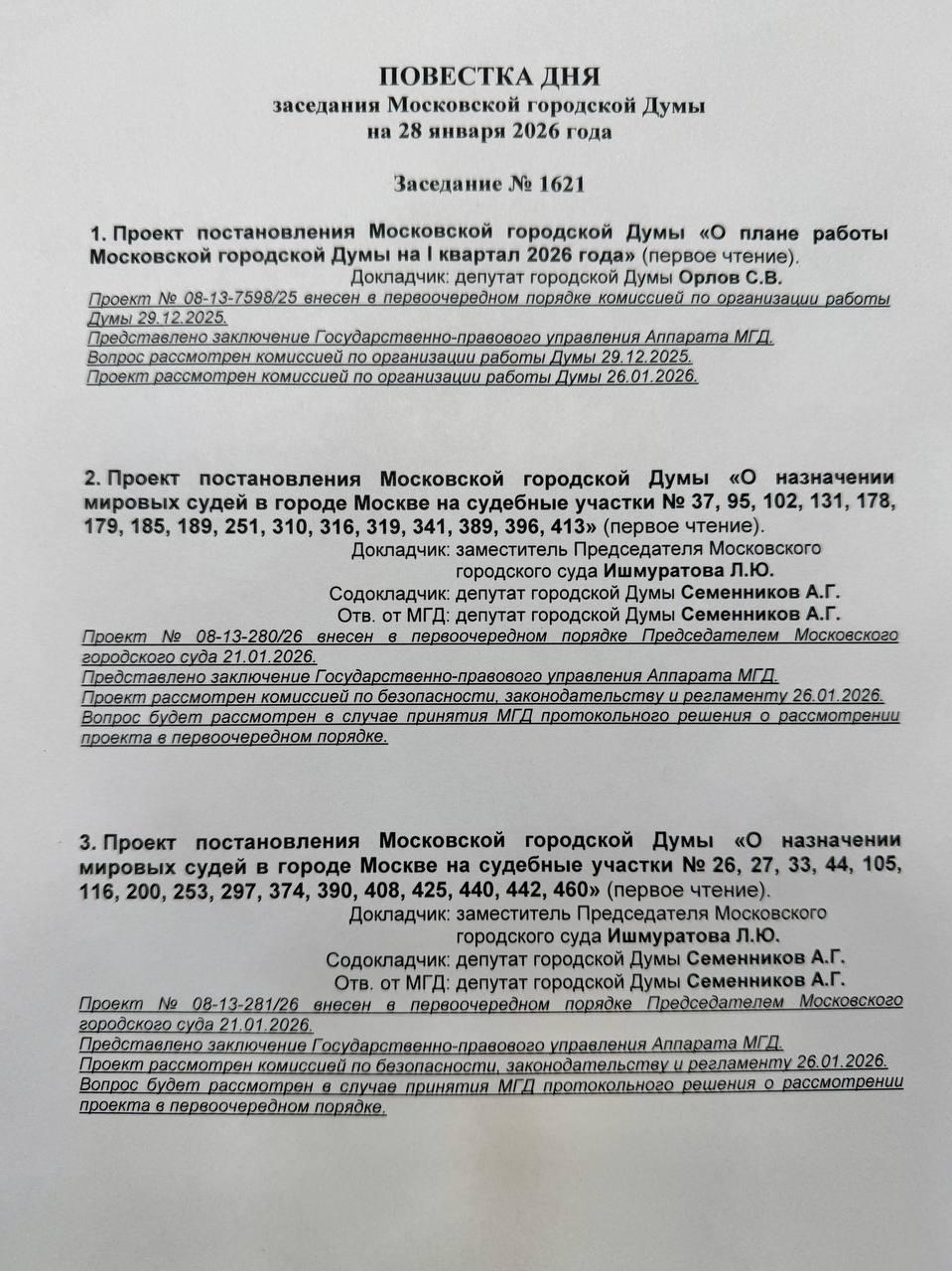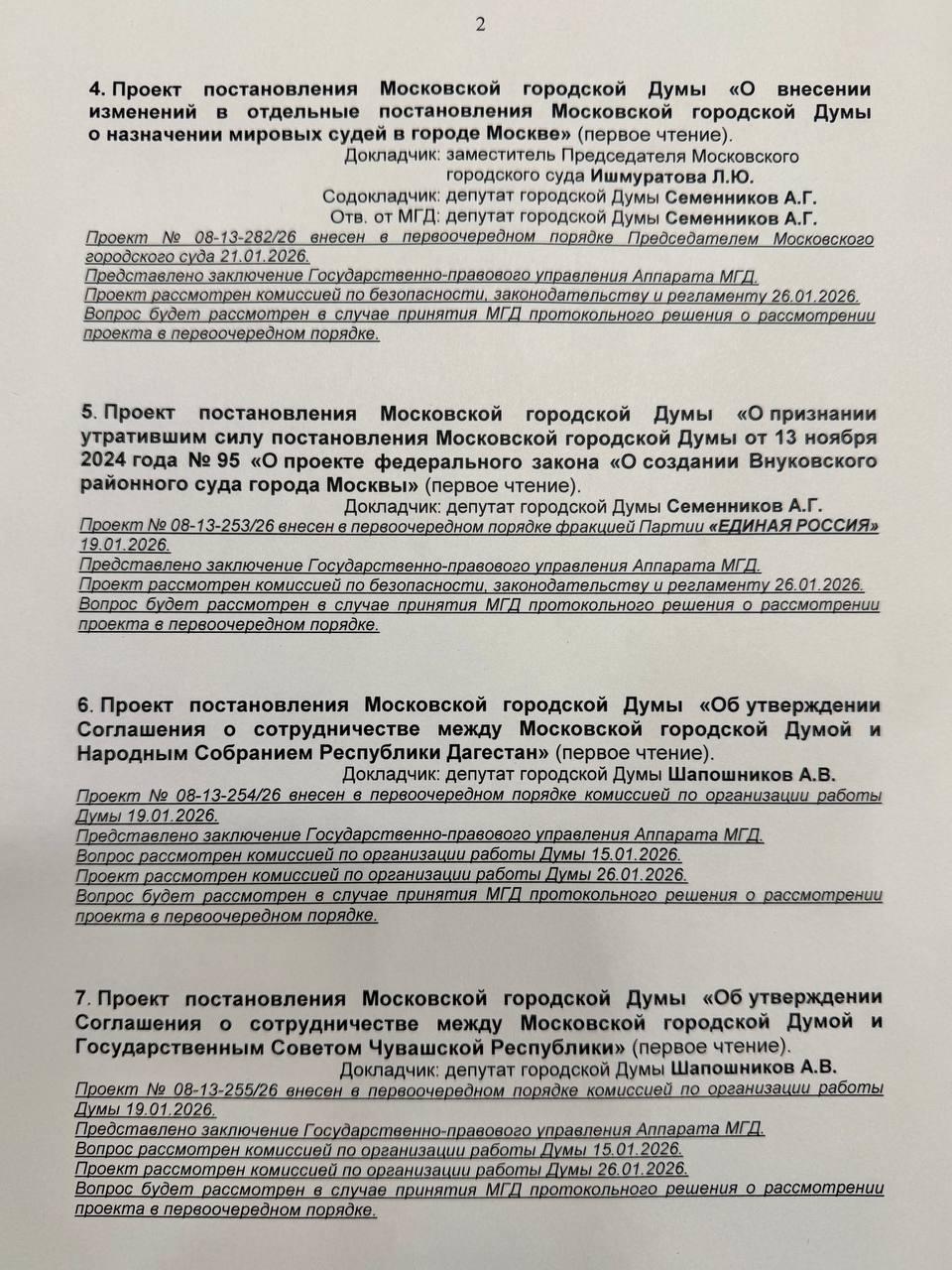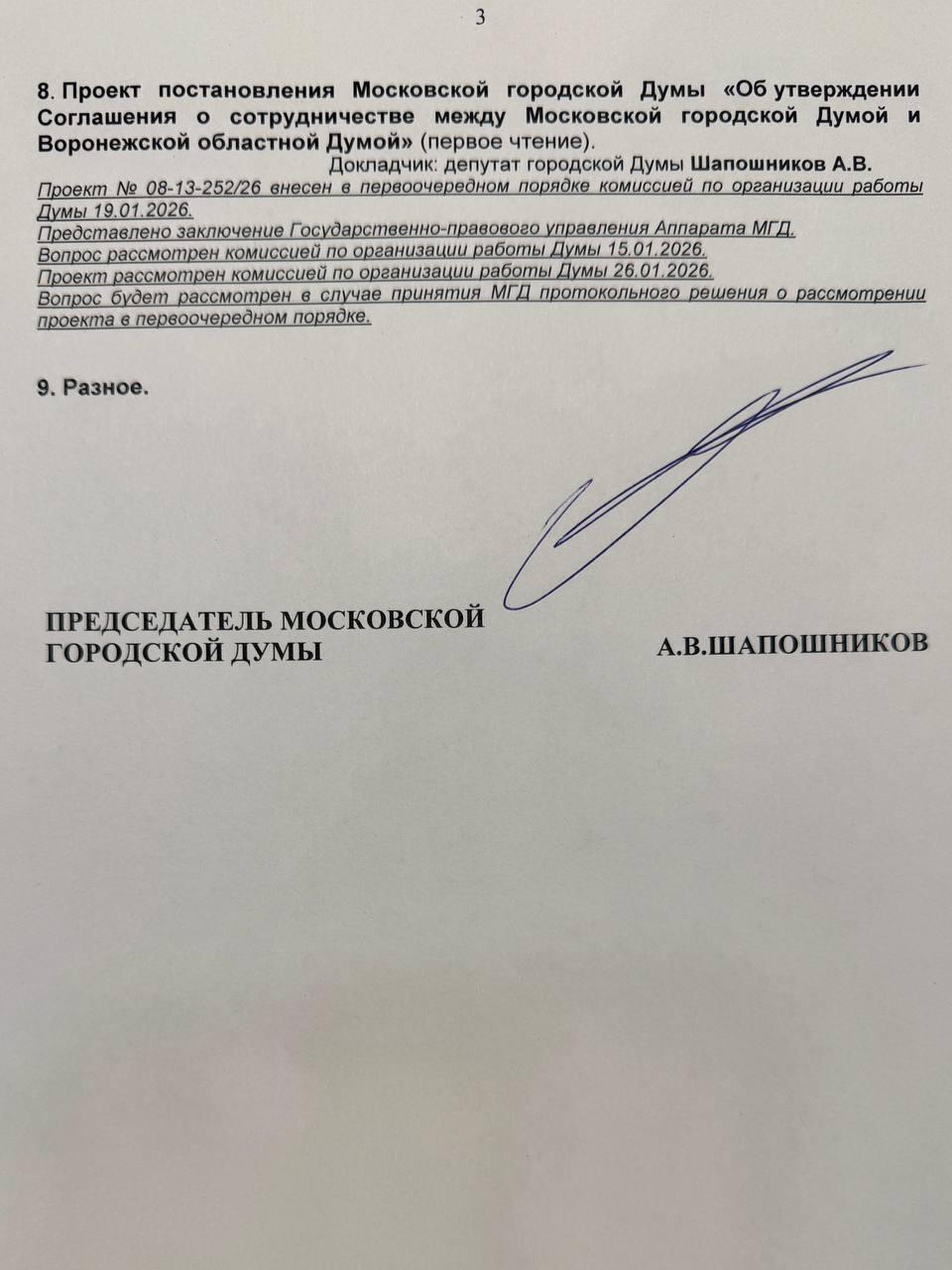 В среду, 28 января, проведем первое пленарное заседание весенней сессии Мосгордумы в 2026 году. Подписал повестку, прилагаю.