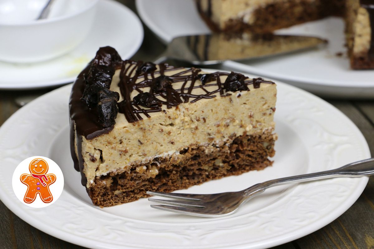 Глазурь из шоколада и масла завершает образ: тонкие подтёки по окружности и украшения из чернослива создают приглушенную, домашнюю элегантность. Время на застывание — минимум суток для идеальной текстуры, хотя и несколько часов работают.