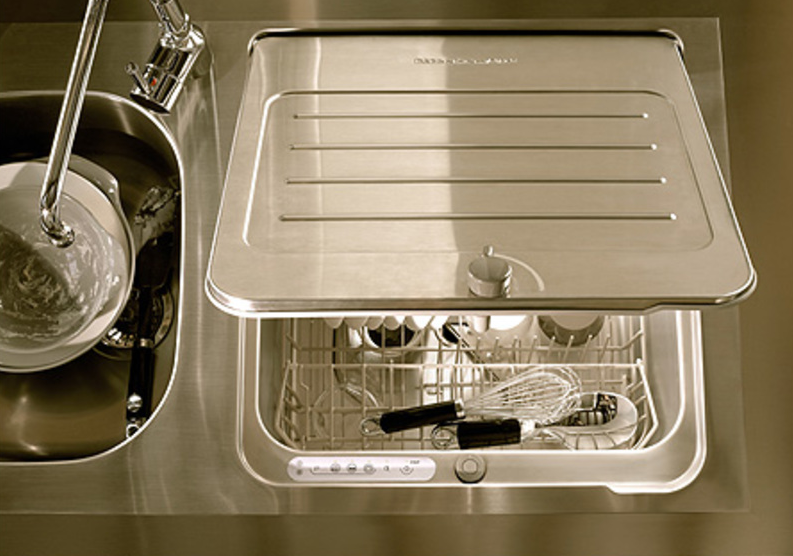 Раковина с встроенной посудомойкой подсказывает, что угловой угол не обязан быть «мусорной ямой» — компактная машина встраивается в точку и освобождает место под дверцу шкафа. Вместе с тем семья получает лёгкость при утренней мойке и вечернем мытье посуды, когда объём и время ограничены.