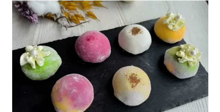 Тесто собирают по шагам из жидкости и сухих компонентов, добавляют краситель по желанию и доводят массу до загустения в микроволновке до нужной консистенции. Остужают до комфортной температуры и переходят к формированию мотис, посыпая руки крахмалом, чтобы лепёшки не прилипали.