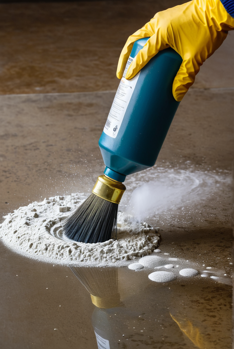 Профессиональные удалители цементного налёта это кислотные составы на основе мягких органических кислот, усиливаемые ПАВ для лучшего смачивания и ингибиторами коррозии для защиты металлов. Их работа проста и эффективна: кислота нейтрализует щелочные соединения кальция, превращая карбонаты и гидроксиды в растворимые соли. Визуальный признак реакции шипение и пенообразование с выделением углекислого газа.